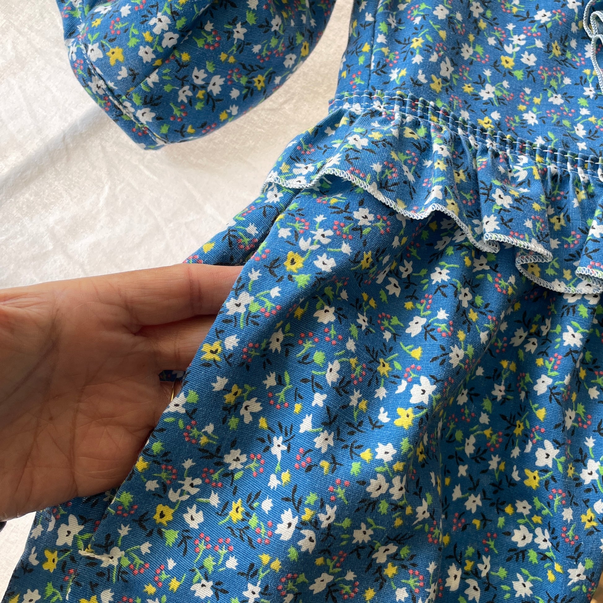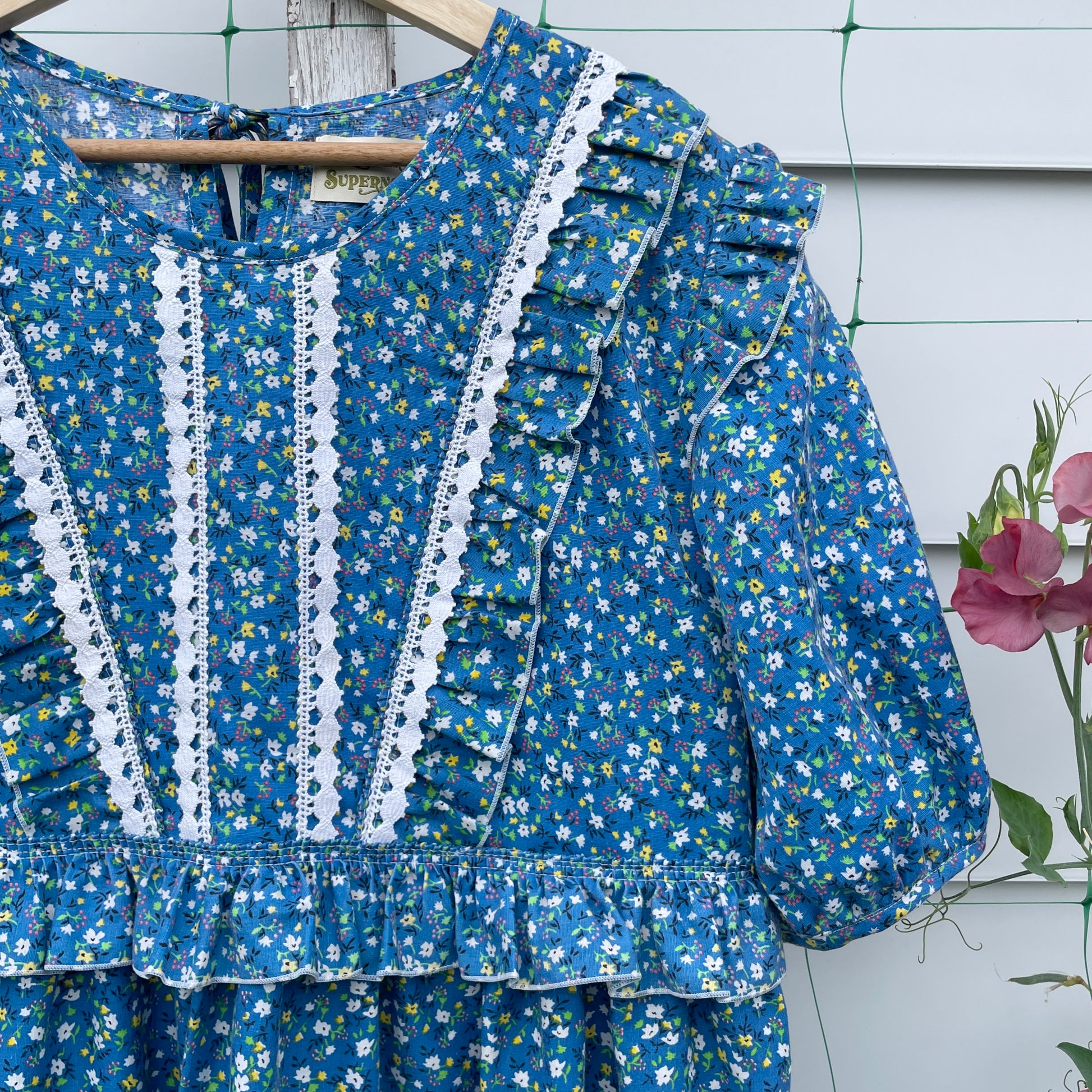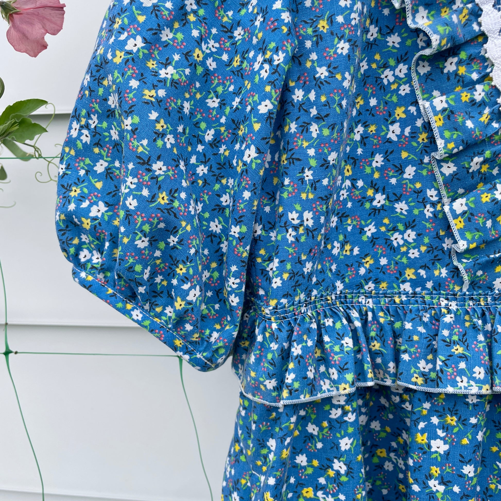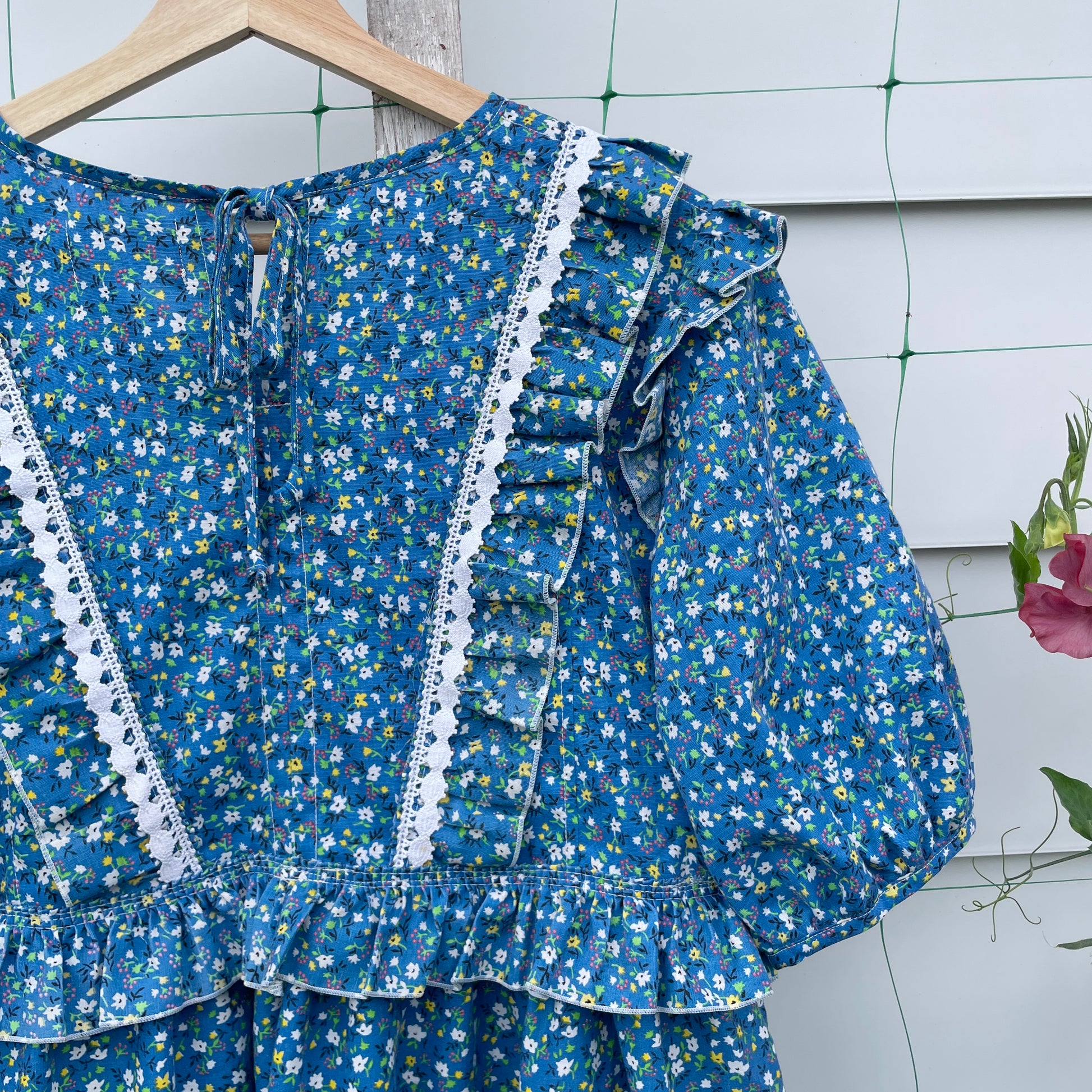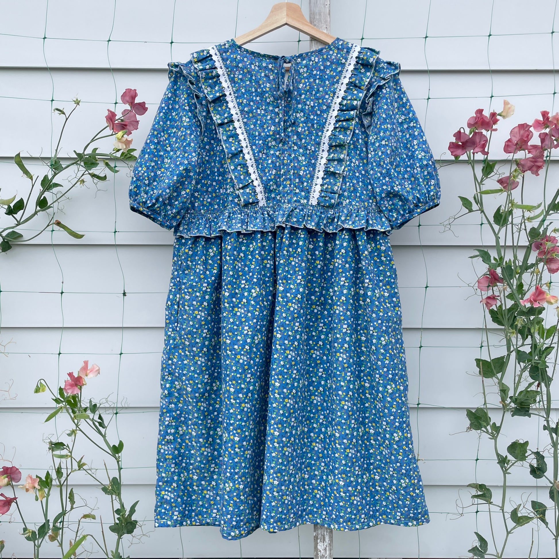 One of a kind prairie dress made from vintage blue floral curtains. It has a relaxed oversized fit, with a round neckline, short puff sleeves and a gathered midi skirt. Layers of ruffles and white trim along front and back bodice. Pull over style with a tie at back neck. Most important - side seam pockets.