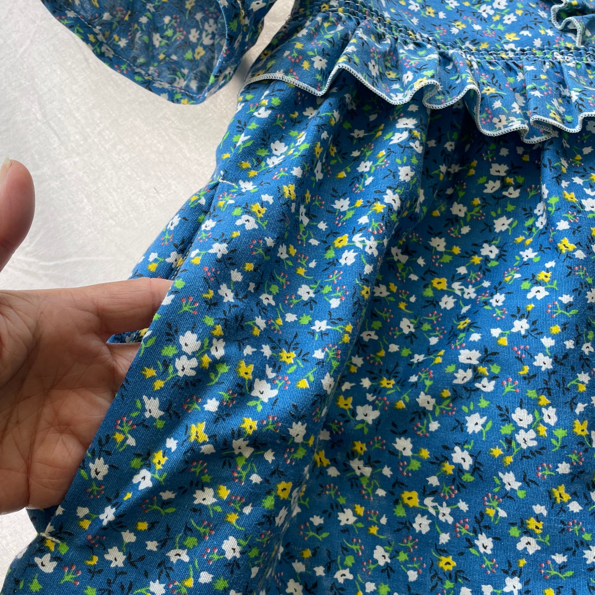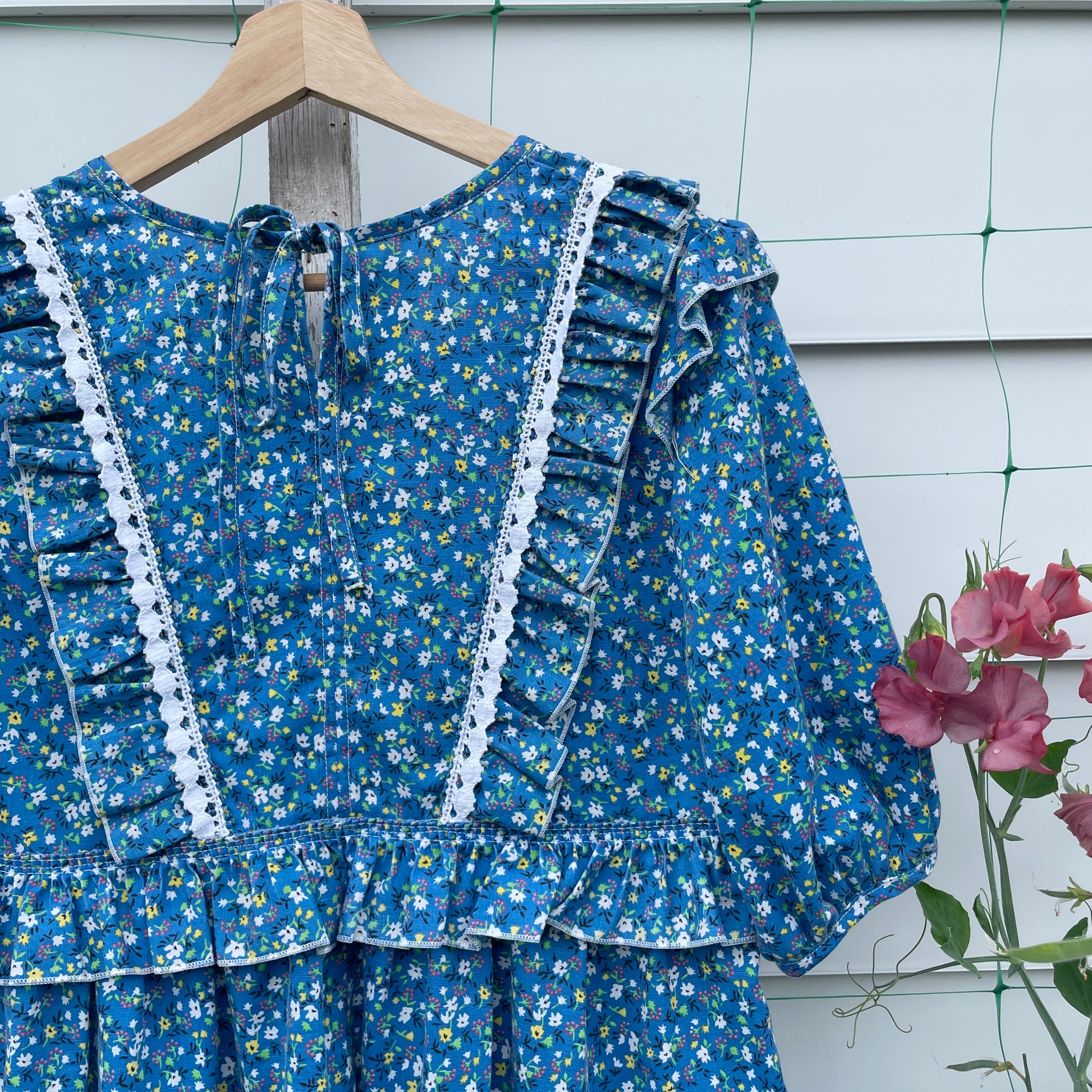 One of a kind prairie dress made from vintage blue floral curtains. It has a relaxed oversized fit, with a round neckline, short puff sleeves and a tiered midi skirt. Layers of ruffles and white trim along front and back bodice. Pull over style with a tie at back neck. Most important - side seam pockets.