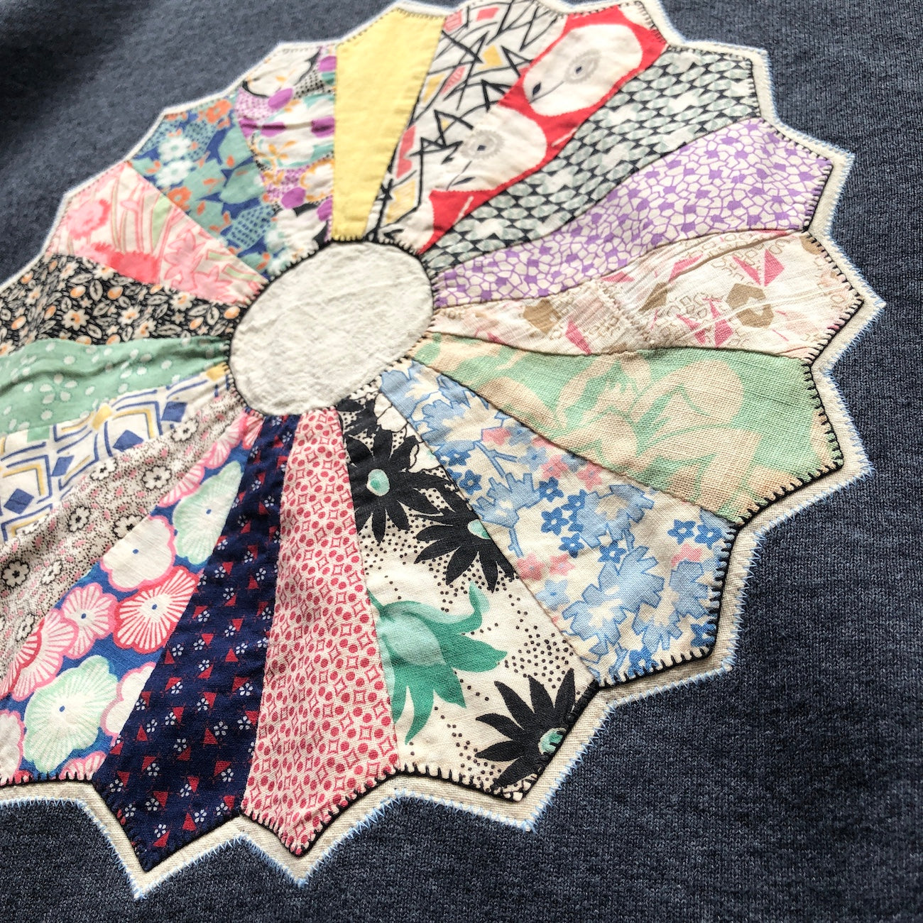 Cozy pre-owned sweatshirt with vintage quilt patch. This patchwork appliqué was repurposed from an unfinished quilt made in my favourite pattern - the Dresden Plate. It consists of 19 'petals' in colourful, vintage floral prints, pieced together by hand.