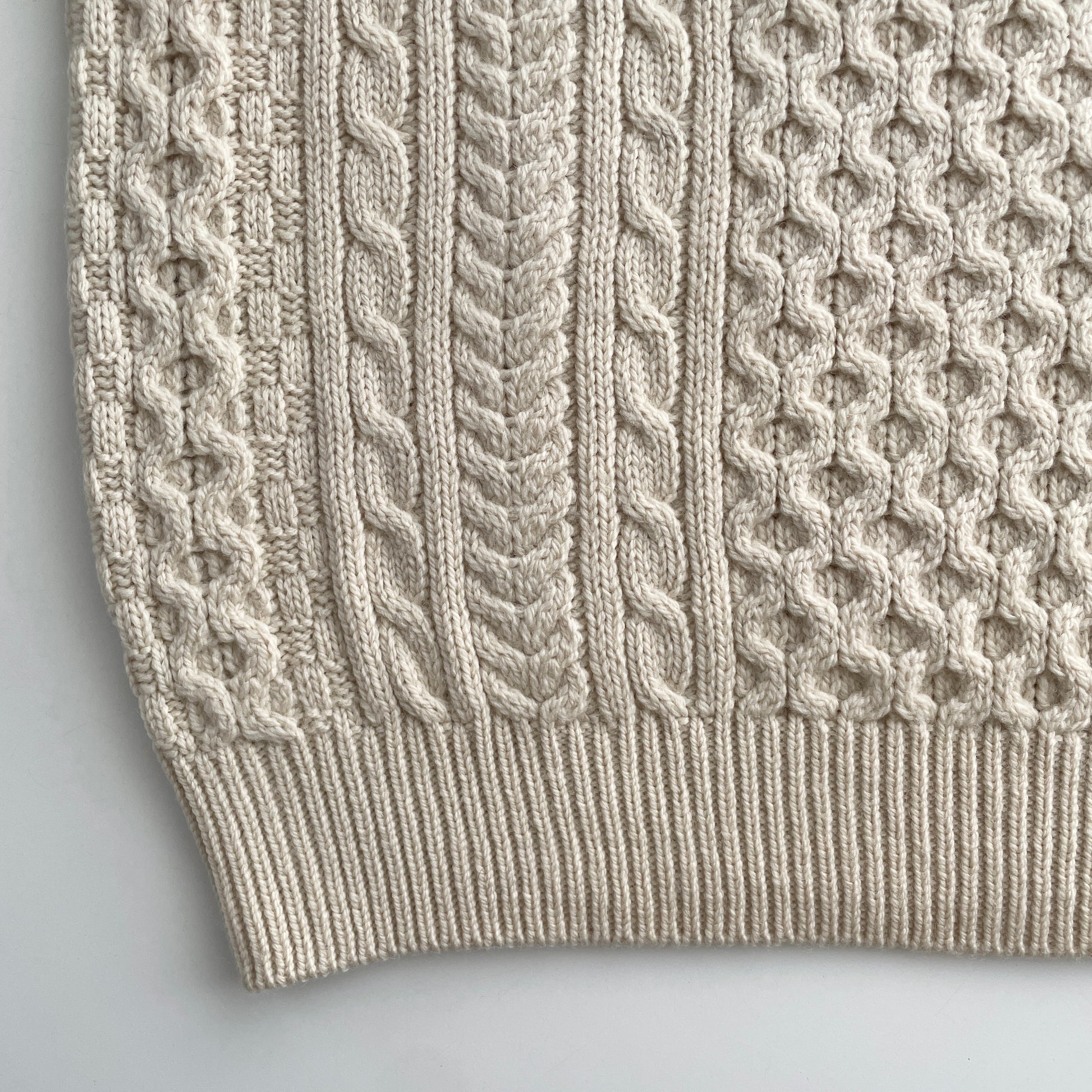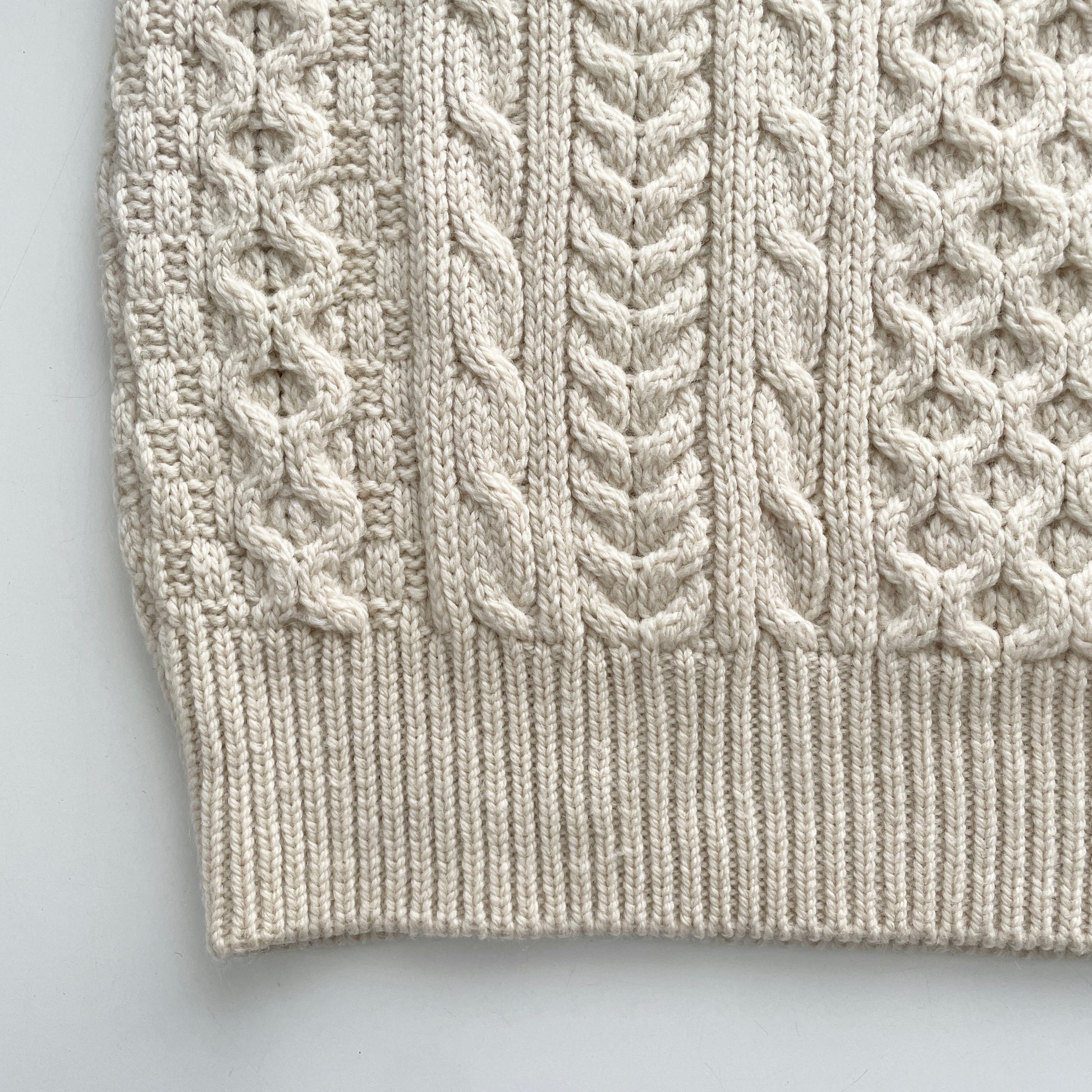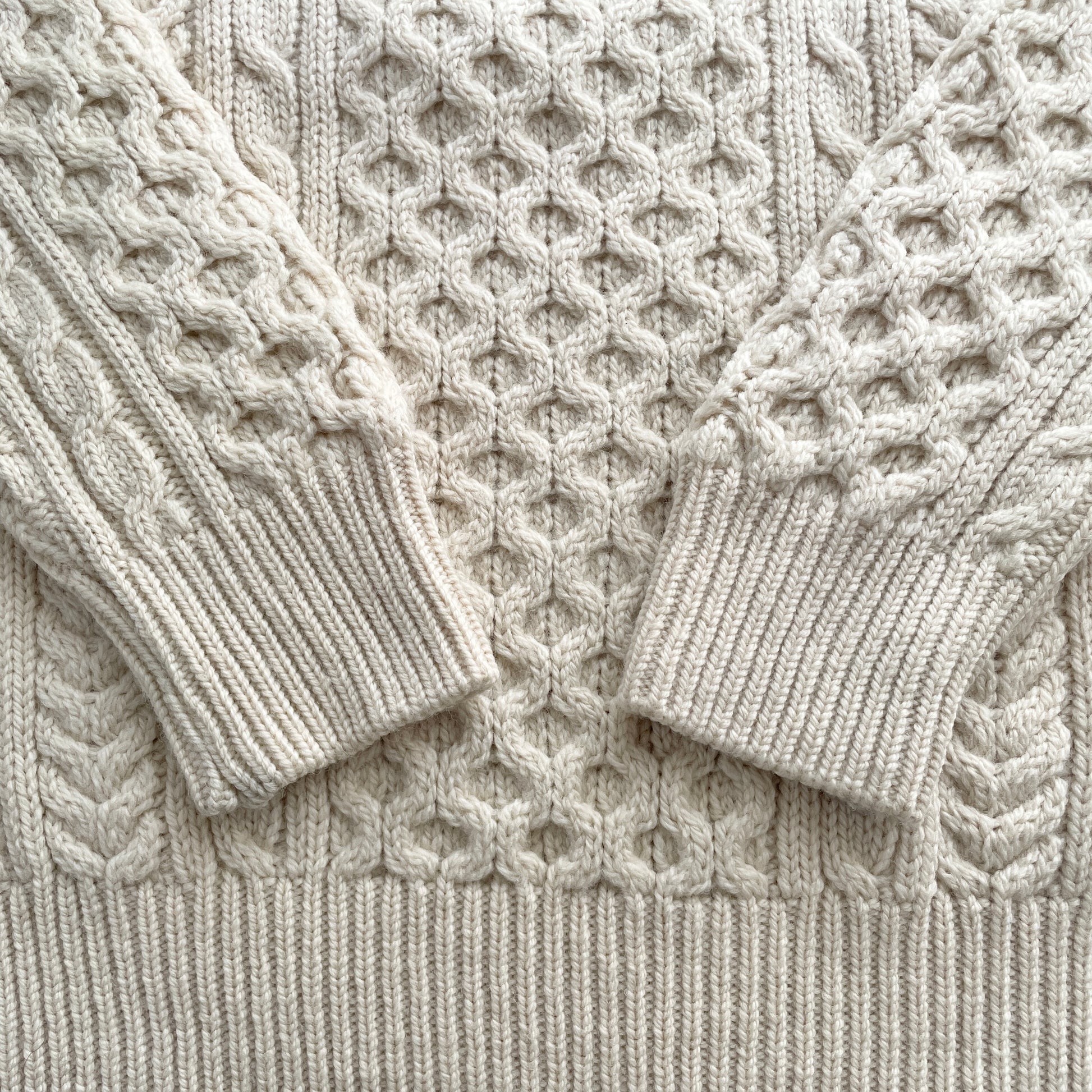 This classic Aran Fisherman sweater was hand knit in Ireland using 100% Merino Wool. Merino wool is finer and softer than regular wool so it's more comfortable to wear. An impressive stitch combination makes for a complex, cozy texture. The Cable stitch represents a fisherman's rope and symbolizes hope, safety and good fortune, while the honeycomb stitch (down center) symbolizes the bees' hard work and a good catch at sea. Beautiful quality and condition.