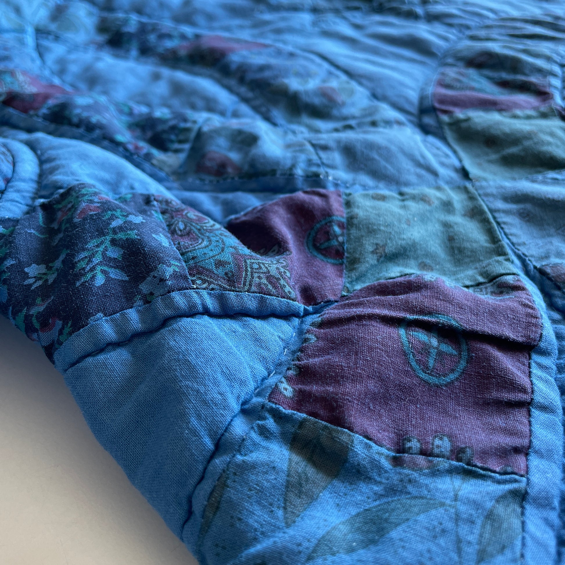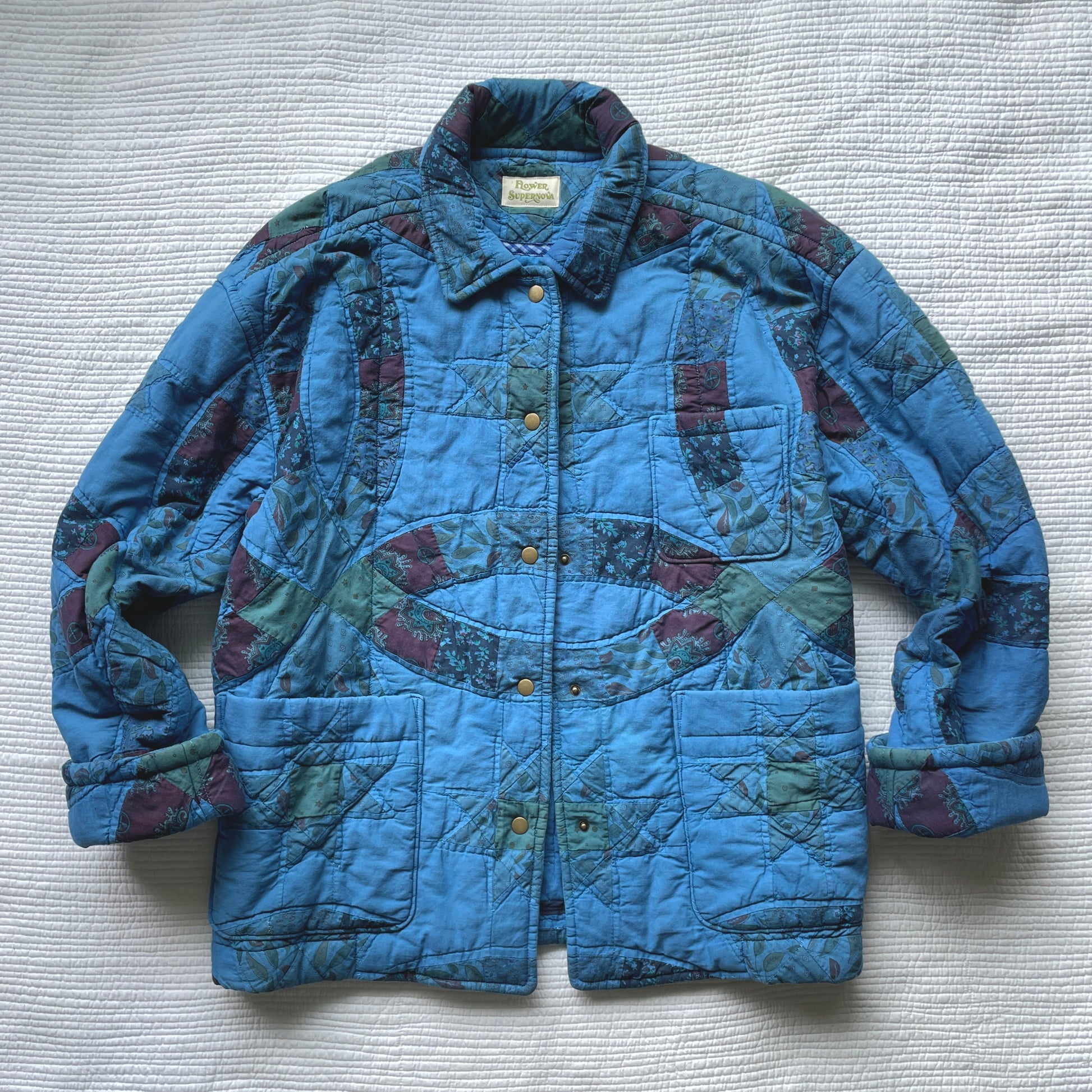 After sewing was complete, I garment dyed the jacket blue and love the way it turned out! Truly one-of-a-kind. It's a medium weight cozy jacket with a relaxed fit. Sleeves are designed to be cuffed/folded. Snap button center front closure. Unlined. All seams have been bound with bias binding or serged for durability.