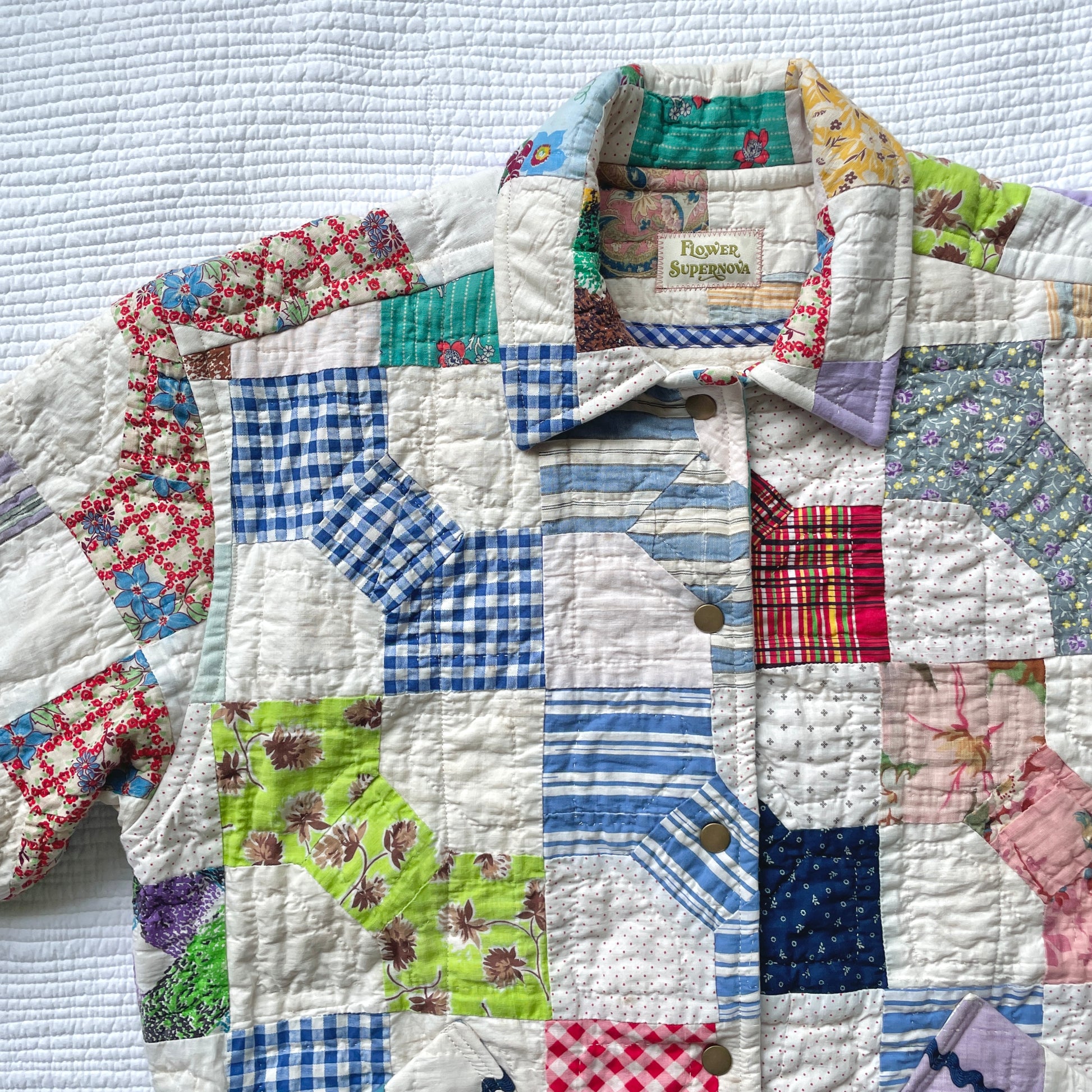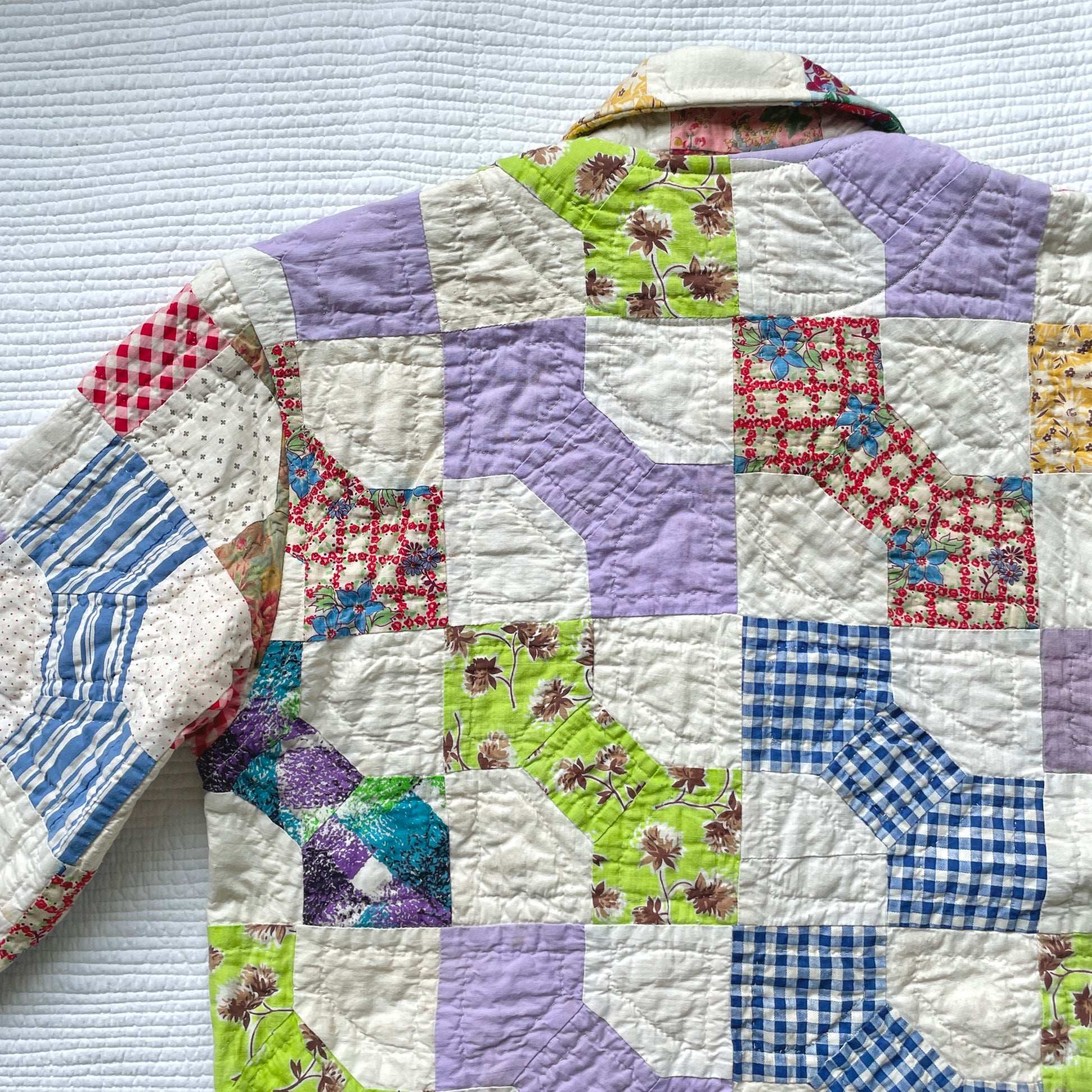 Two pocket chore coat crafted from a vintage Bow-Tie quilt. Patchwork prints include: gingham, floral, stripes, plaid, paisley and polka dot.
