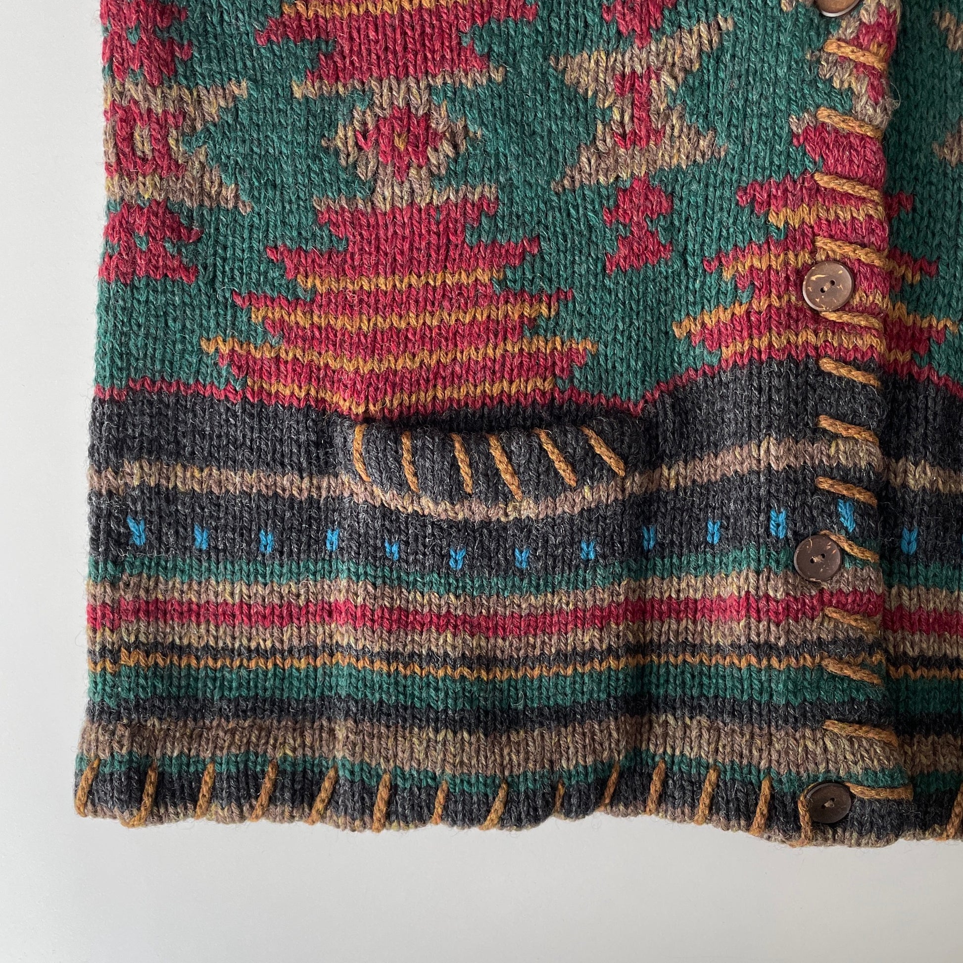 The ultimate cottage cardigan! Cozy shawl collar, relaxed fit, warm chunky yarn. Hand knit blanket pattern in rich earth tones. I just noticed the tan whipstitching detail is missing from one pocket. I can remove it from the other pocket so they match, just let me know at purchase time.