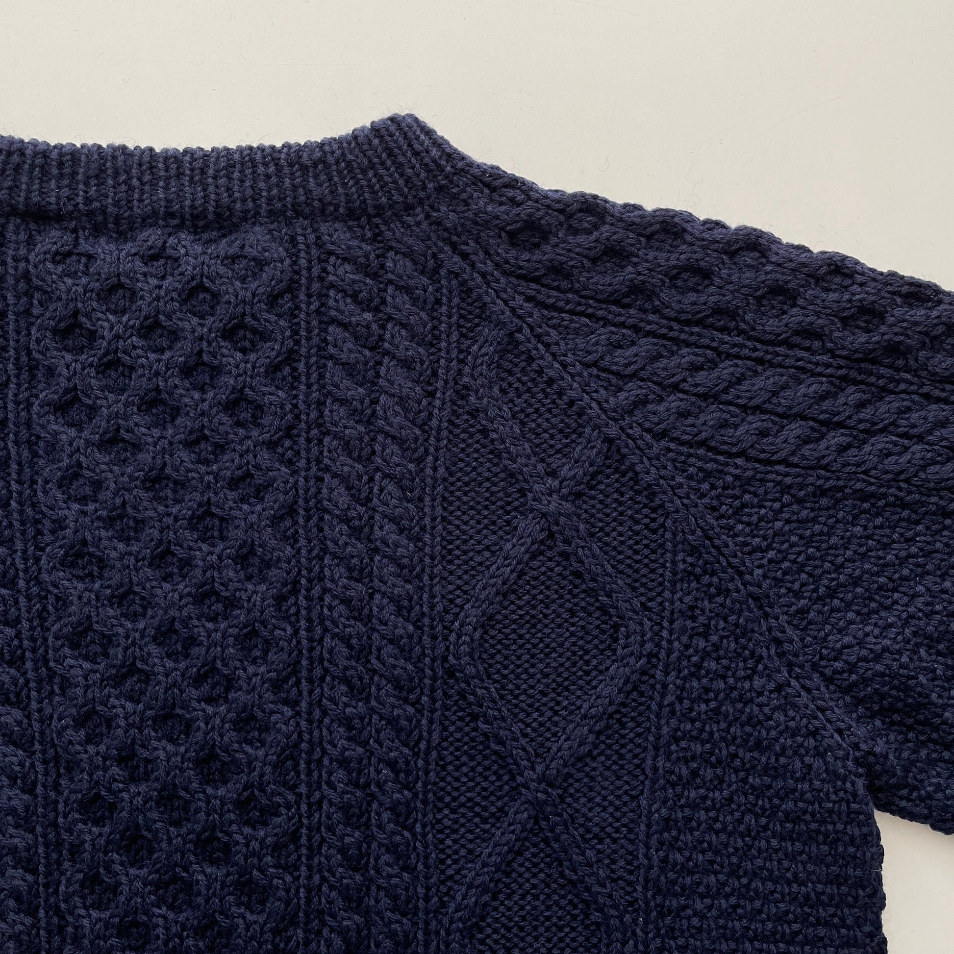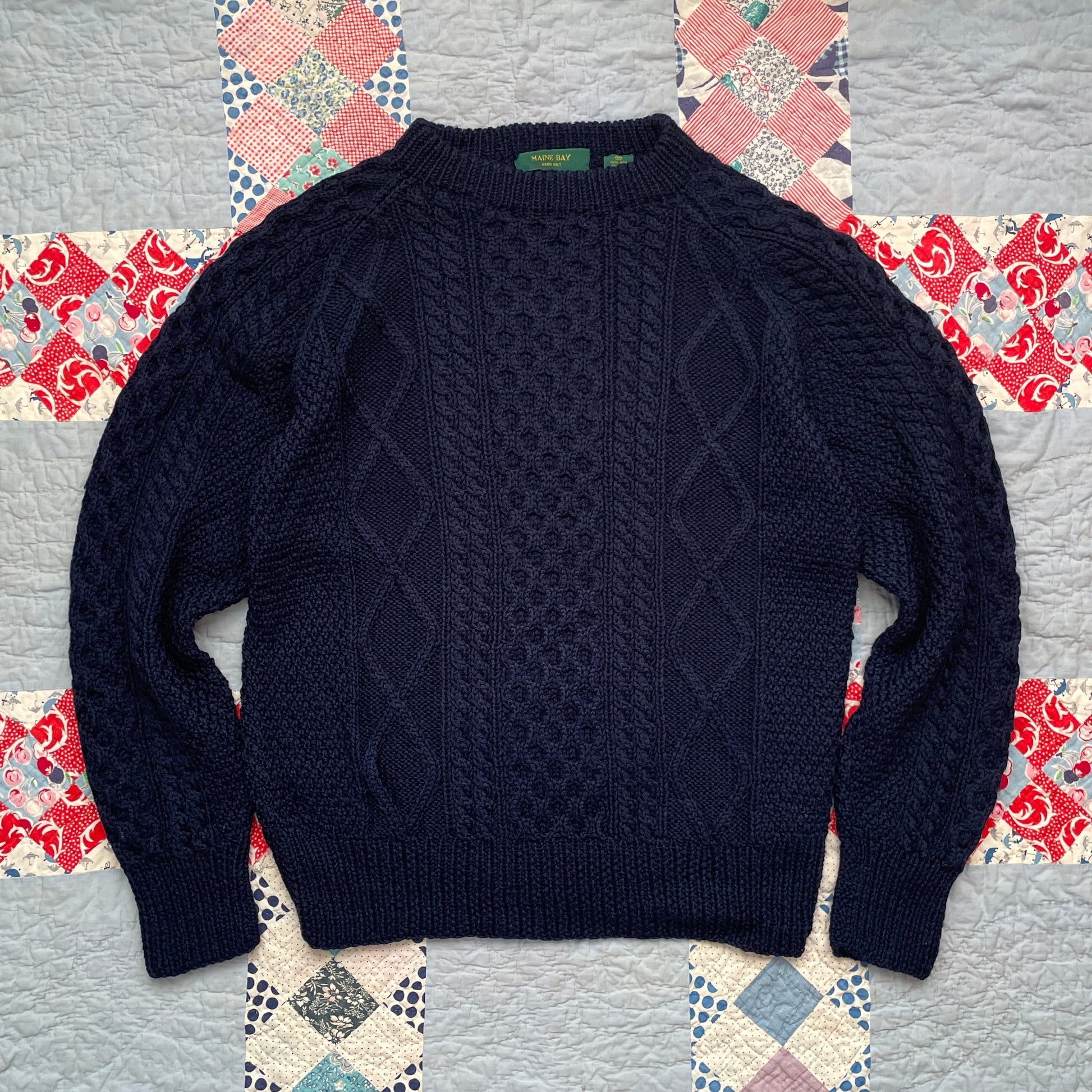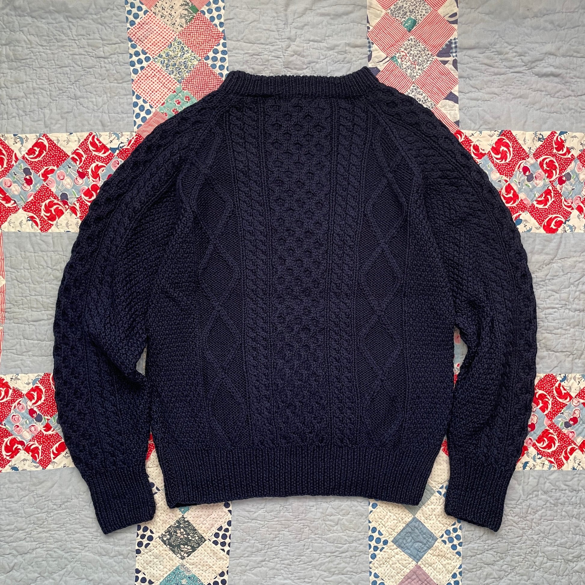Navy blue, soft wool yarn. Crewneck, raglan sleeve, amazing stitch texture. The Cable stitch represents a fisherman's rope and symbolizes hope, safety and good fortune, while the honeycomb stitch (down center) symbolizes the bees' hard work and a good catch at sea.