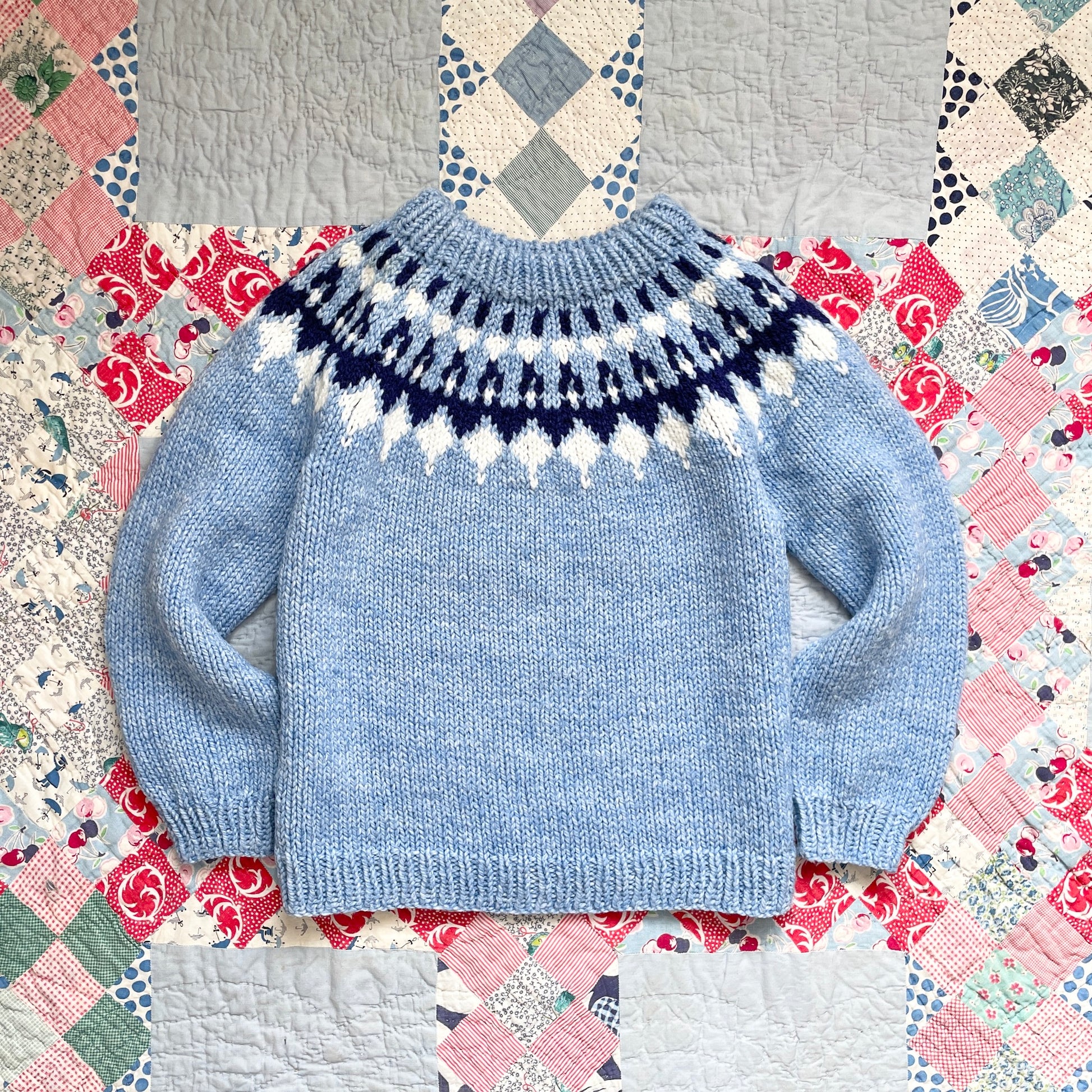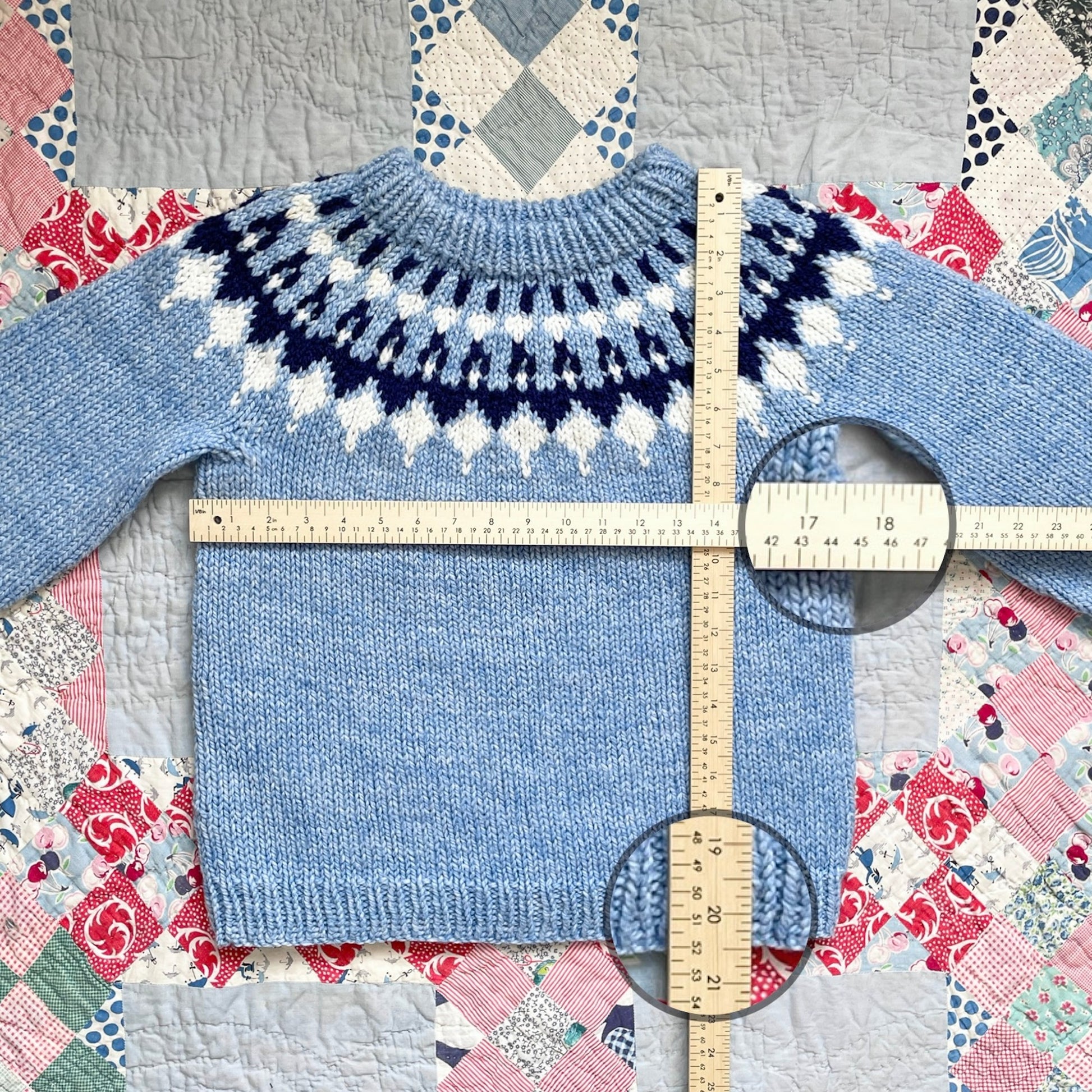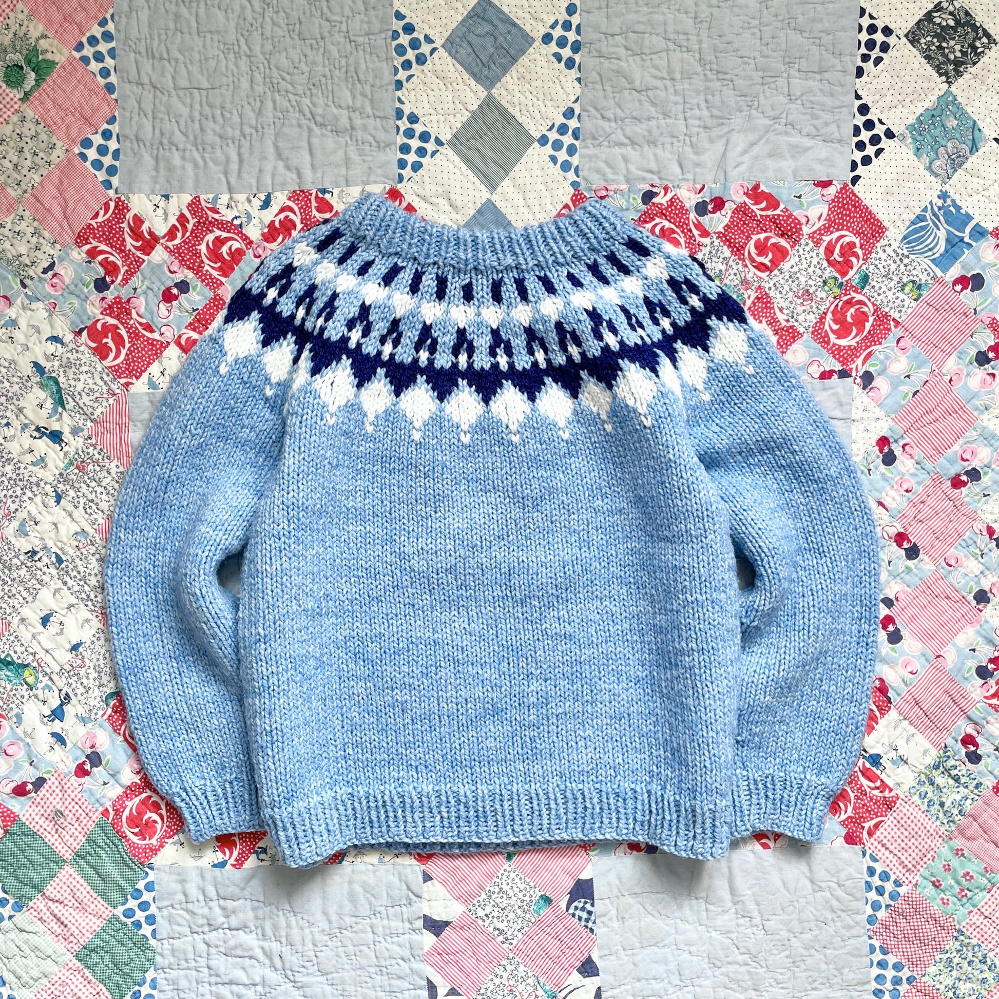 Adorable light blue Fair Isle sweater. Chunky knit. Crew neck. Raglan sleeve.