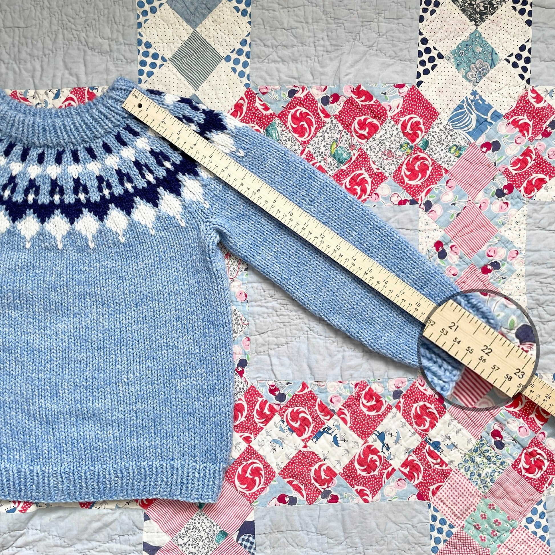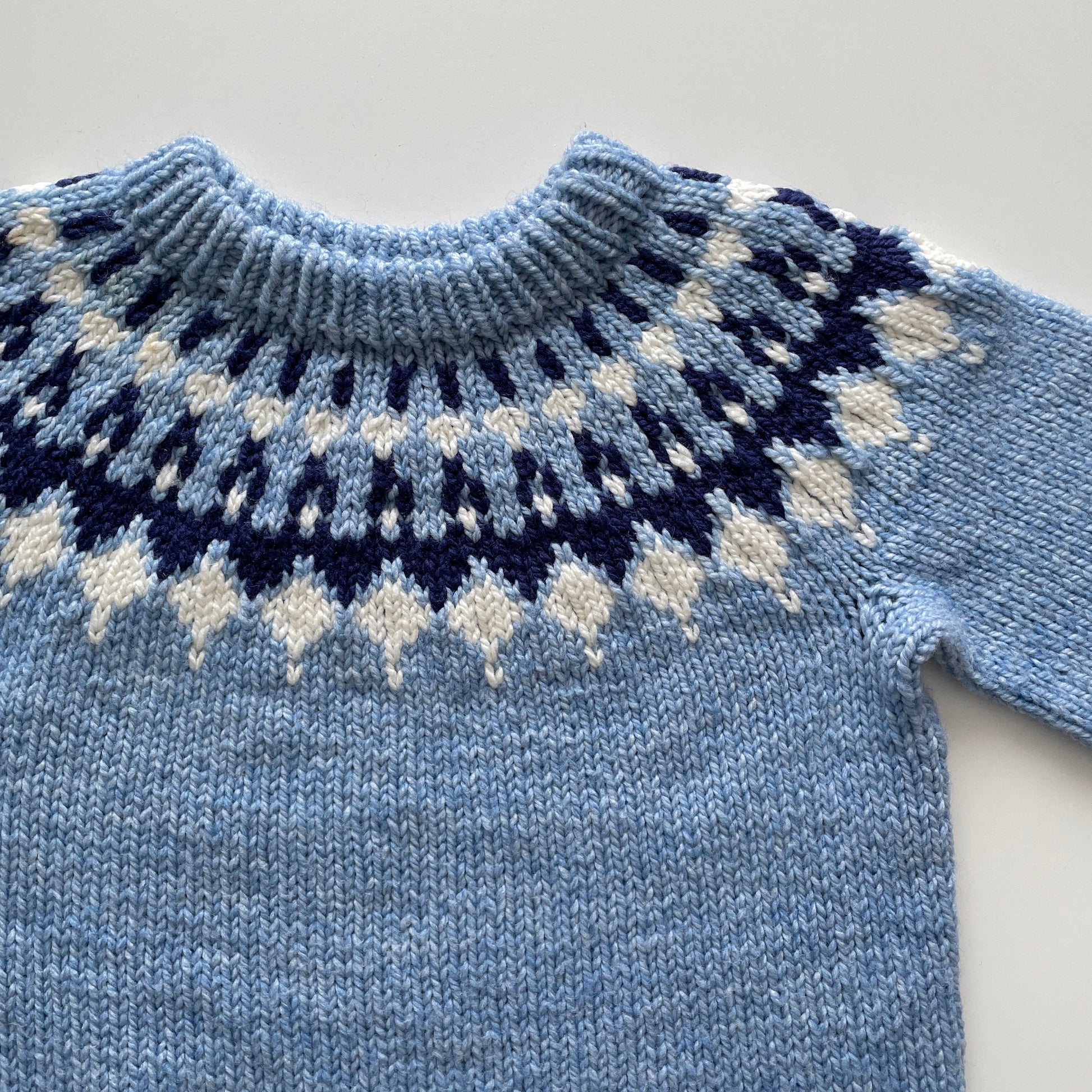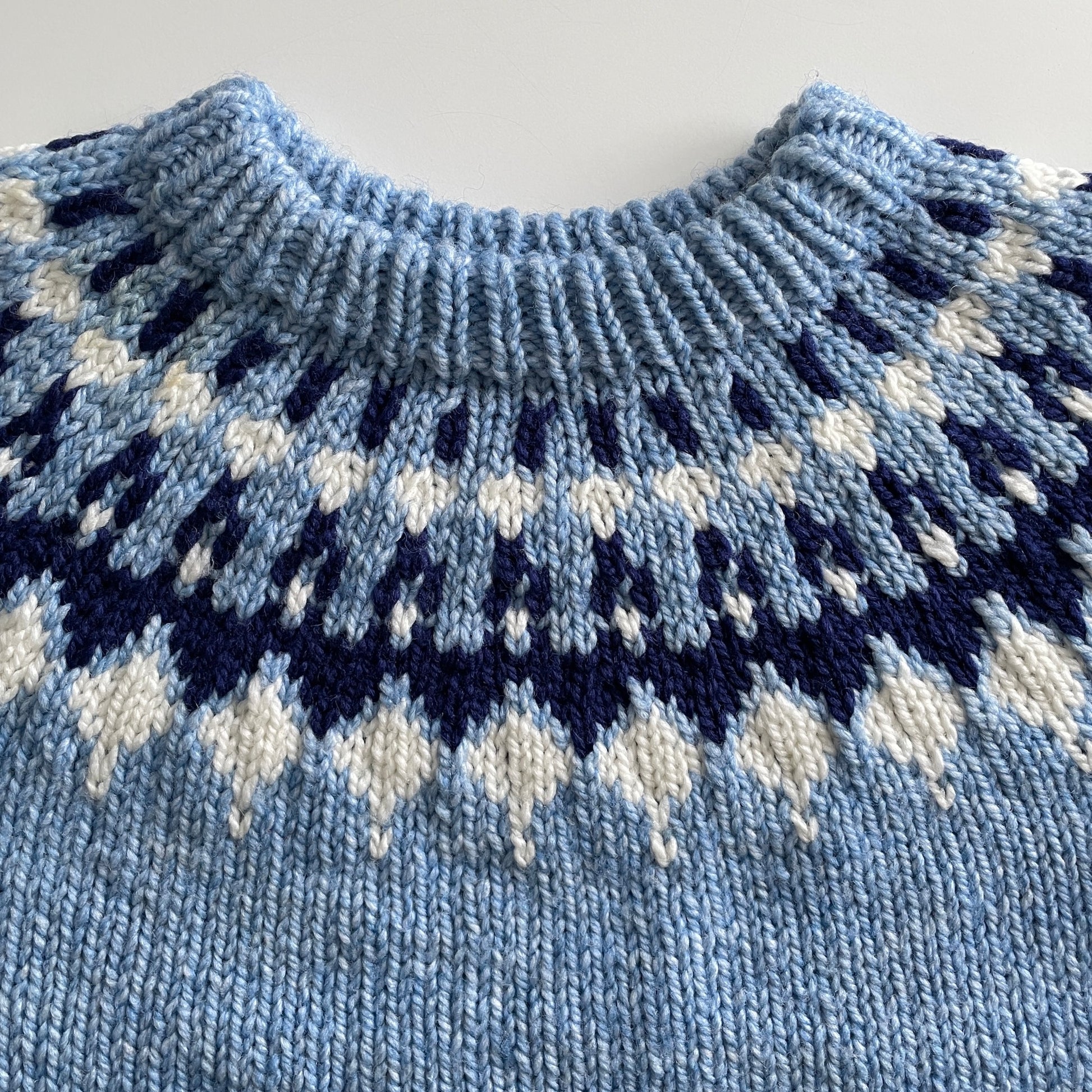 Adorable light blue Fair Isle sweater. Chunky knit. Crew neck. Raglan sleeve.
