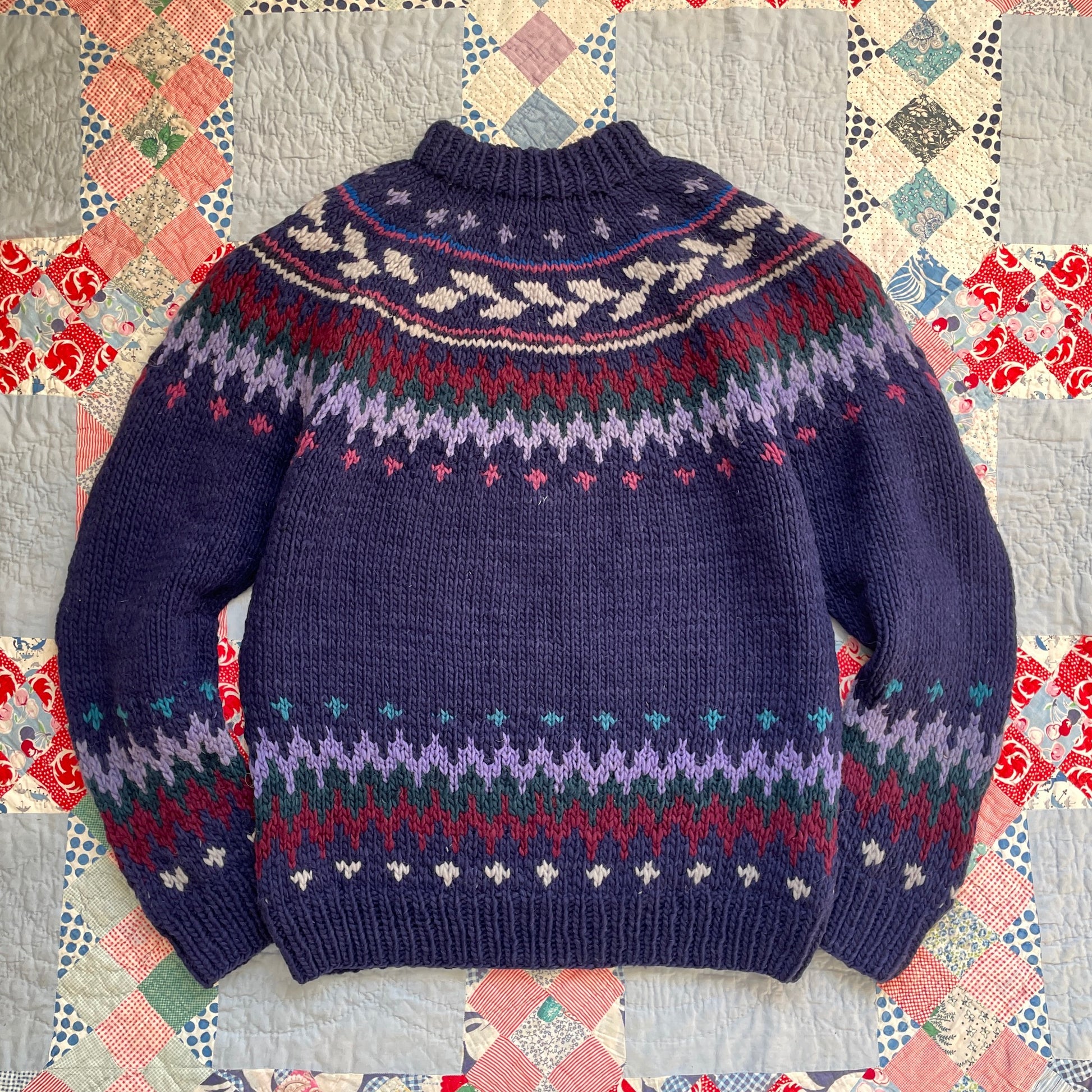 Warm, super chunky knit sweater made for the outdoors! Hand knit fair isle pattern in beautiful shades of blue, burgundy, lilac and cream. Colours are darker in person. Hand made in Ecuador.