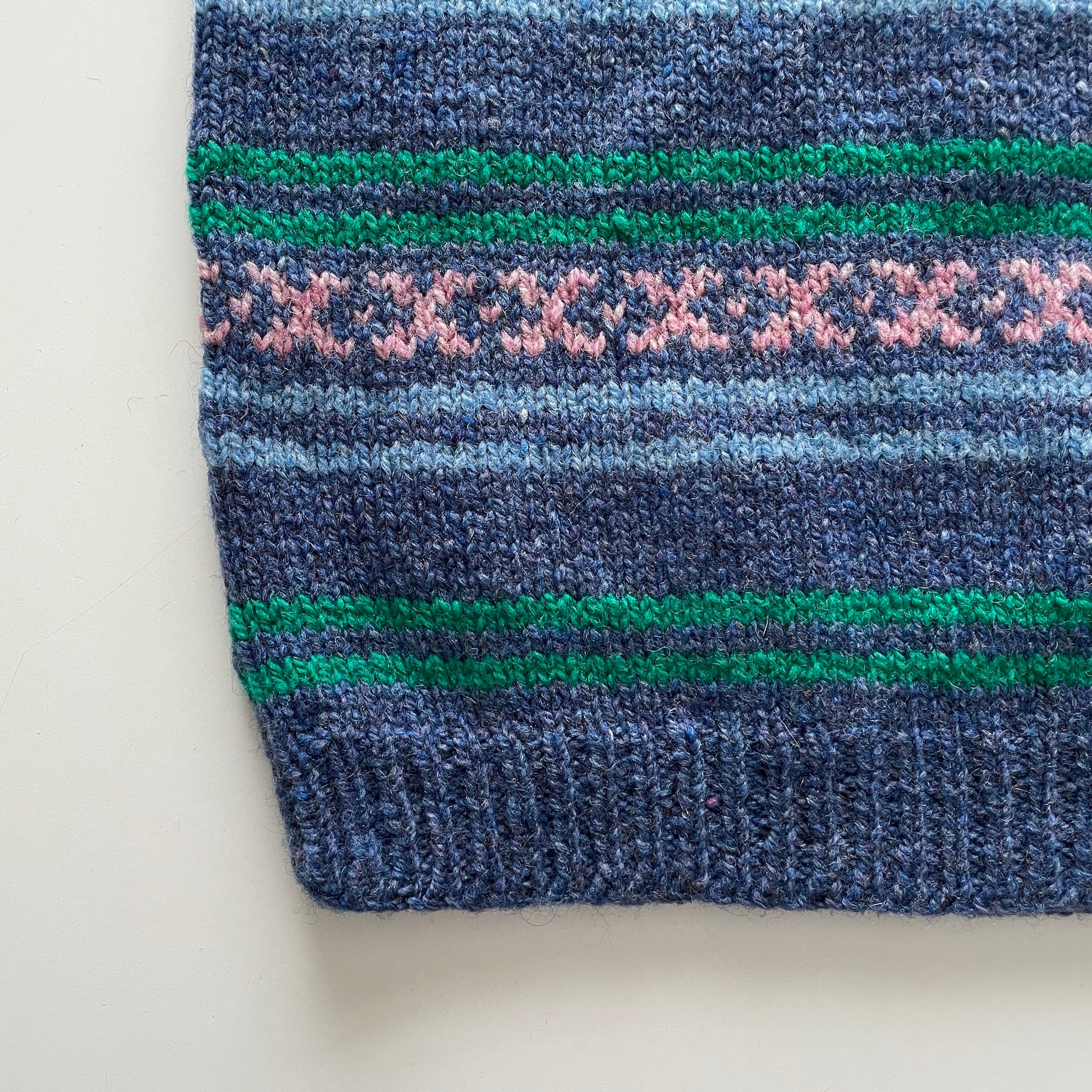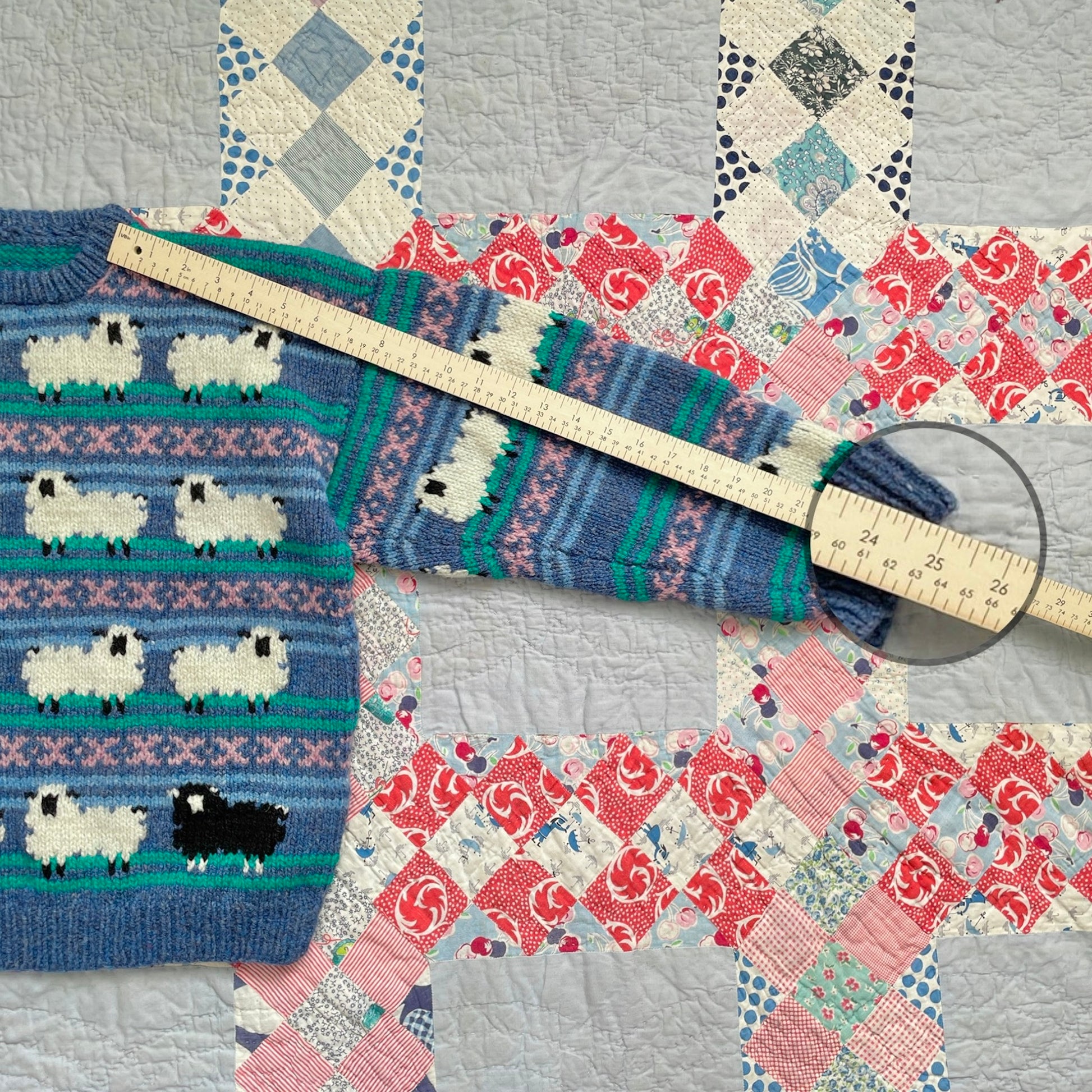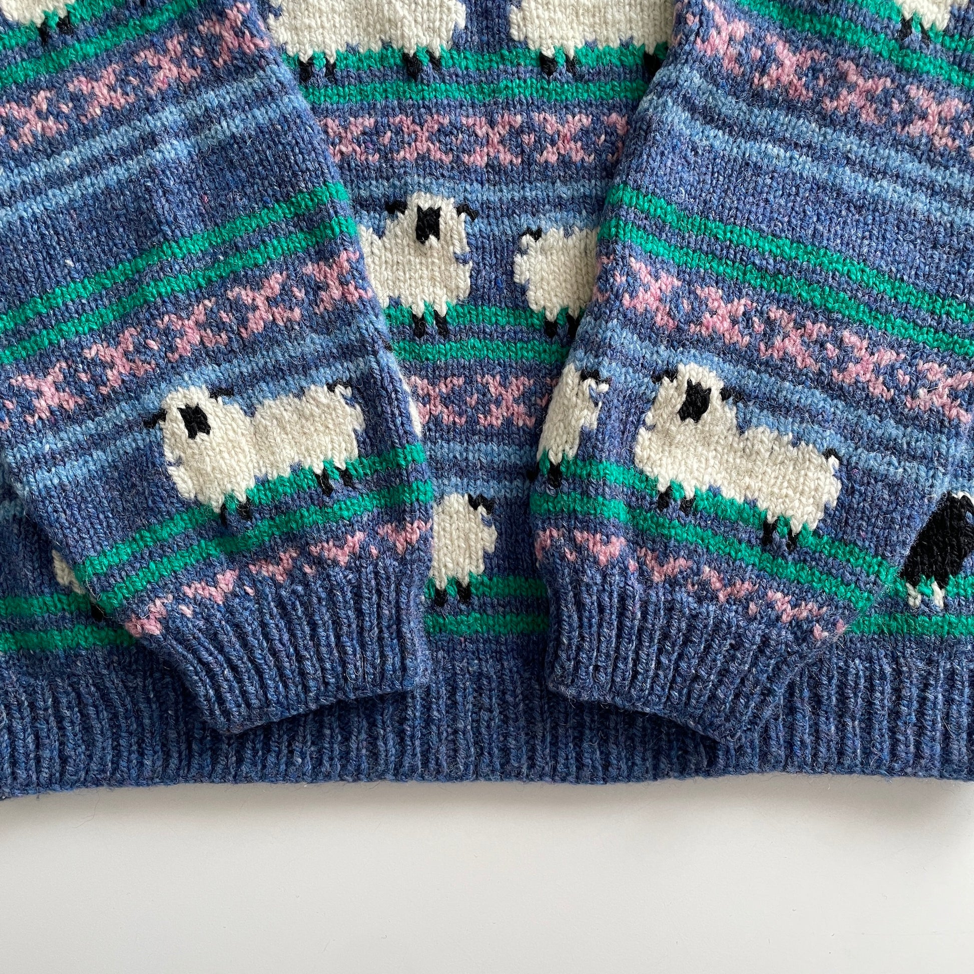 Absolutely the cutest sheep sweater! Rows of little white sheep and my favourite little black sheep in the corner. I love how the pattern is continued on the back. Boxy fit, drop shoulder.