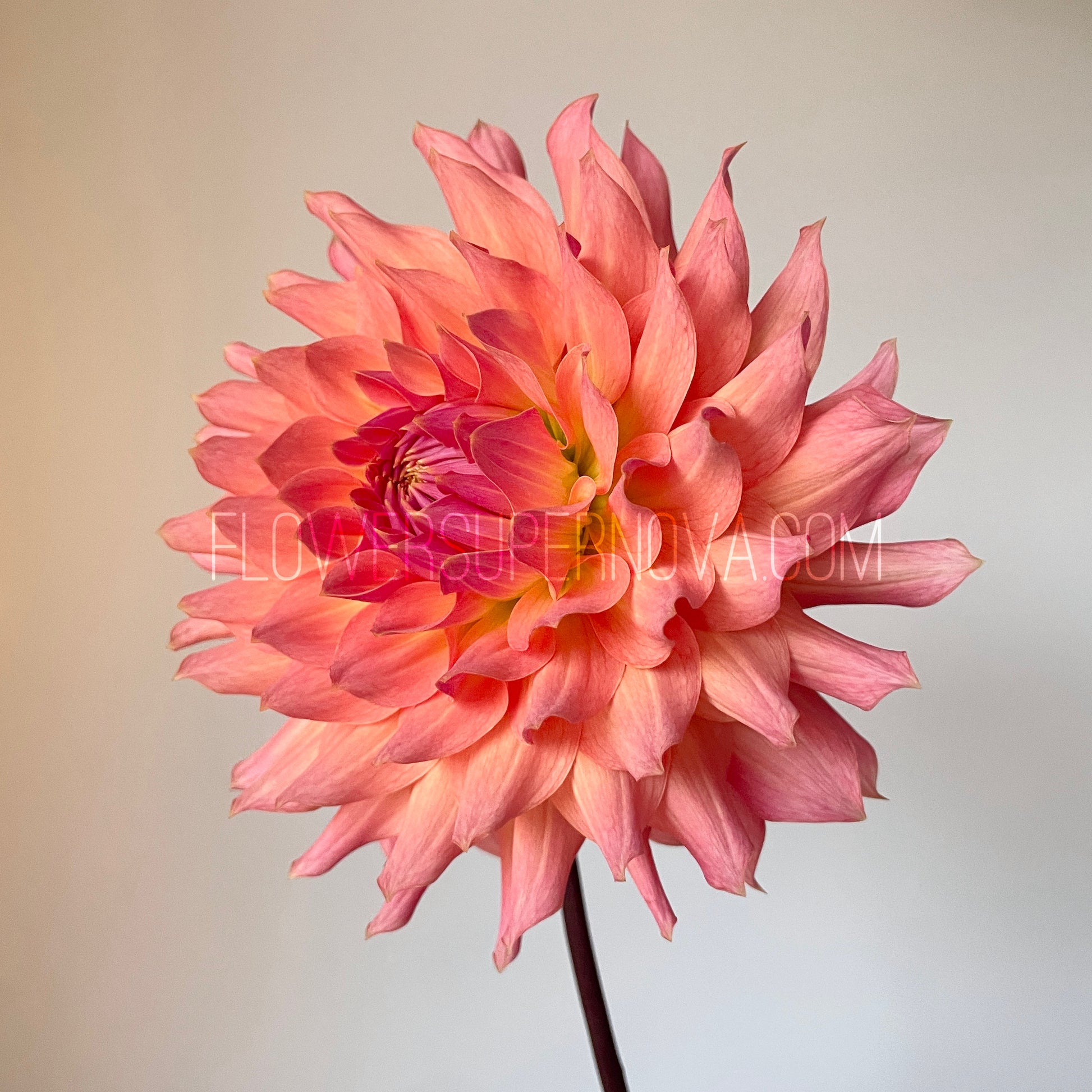 Uniquely coloured semi-cactus dahlia - shades of peach, yellow and pink towards the center.