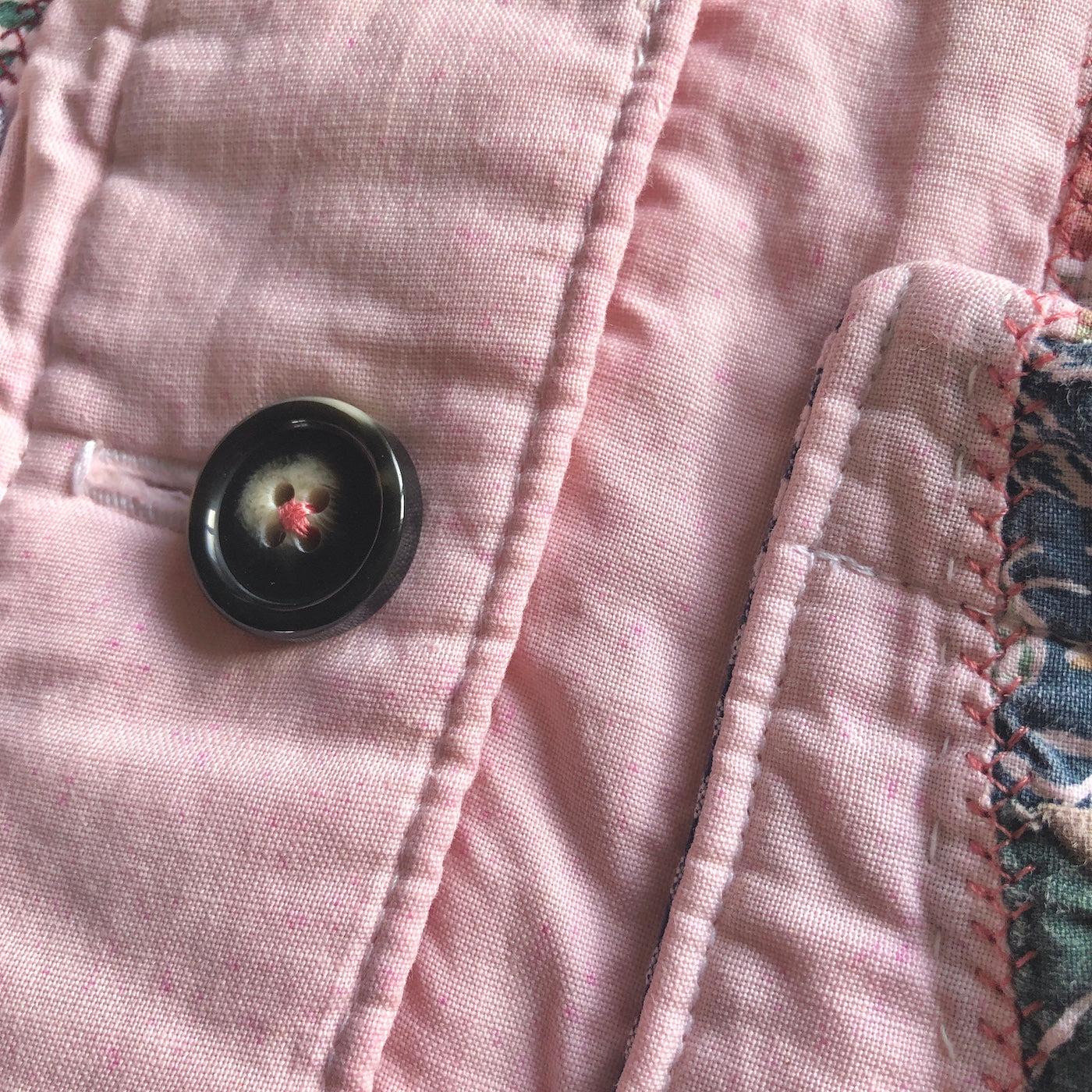 I've machine mended certain seams with burgundy, dusty pink, and blue embroidery. After sewing was complete, I garment dyed this jacket light pink and love the way it turned out! It's lightweight with a relaxed fit. Unlined. All seams have been bound with bias binding for durability.