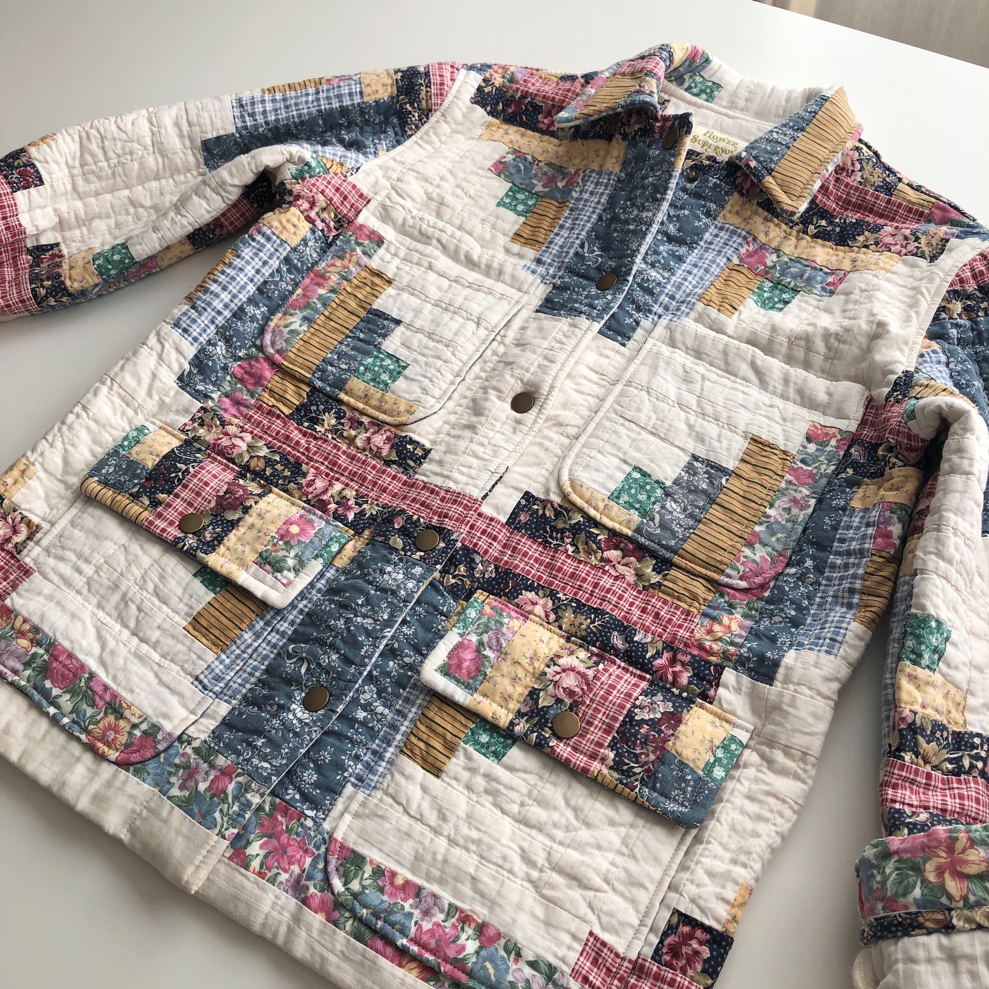 Four pocket chore coat crafted from a preloved Log Cabin quilt. The centre square of a Log Cabin pattern represents the hearth of the home and it's always surrounded by light and dark rectangle "log" pieces.
