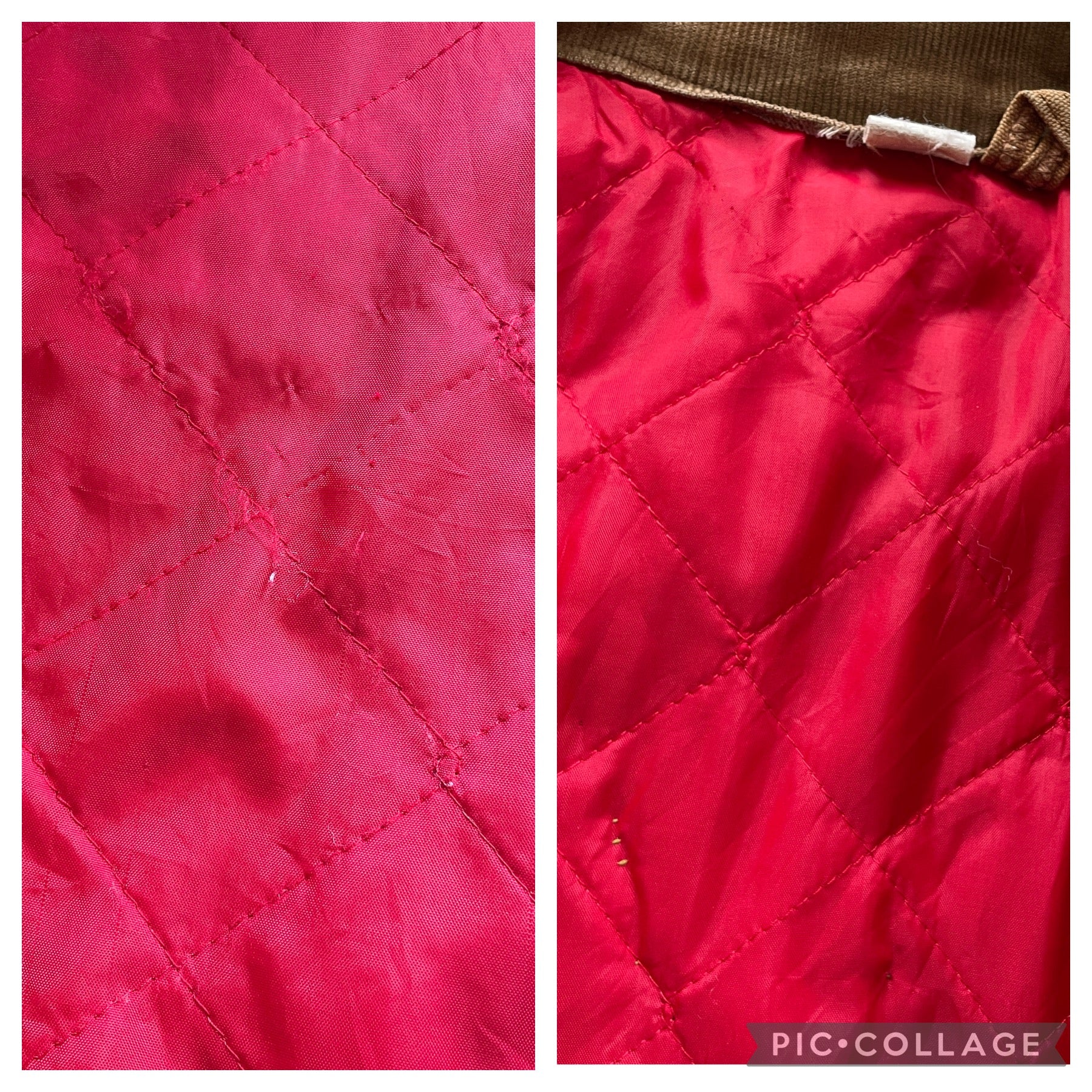 Condition: Well-worn, fading, stains, broken stitches/snags on quilted lining.
