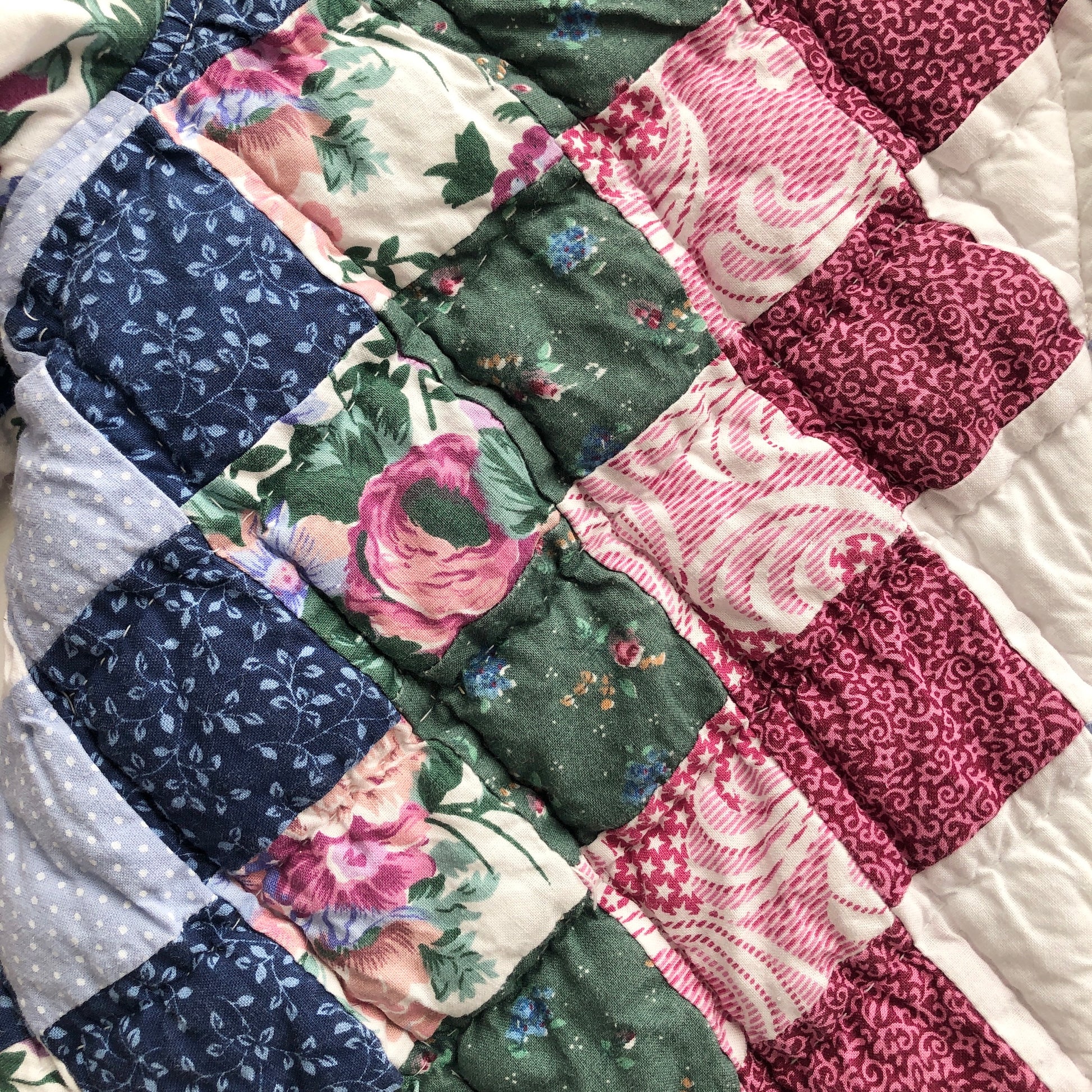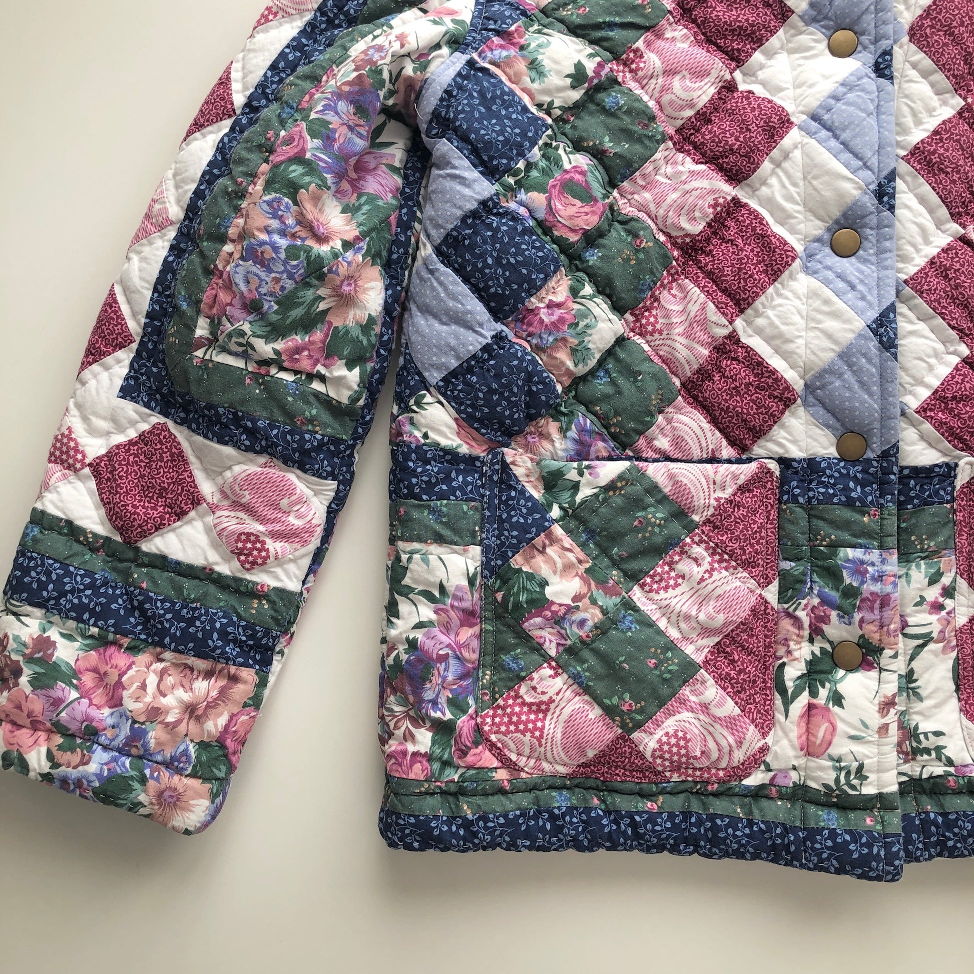 Chore coat crafted from a preloved patchwork quilt. Calicos, country florals and polka dots are quilted in a small diamond pattern. Medium weight with a straight fit. Front patch pockets. Antique brass snap buttons. Unlined. All exposed seams have been overlocked for durability.