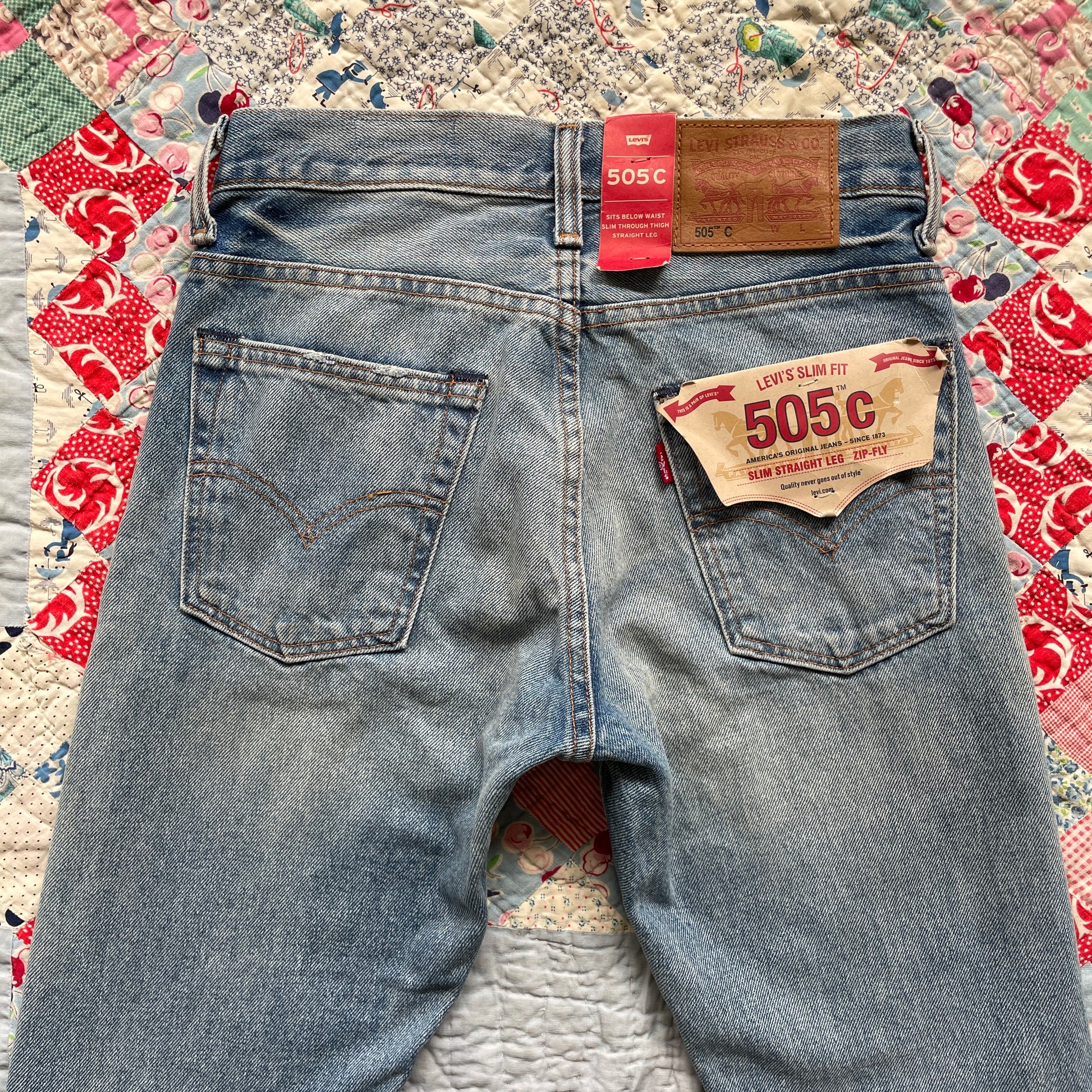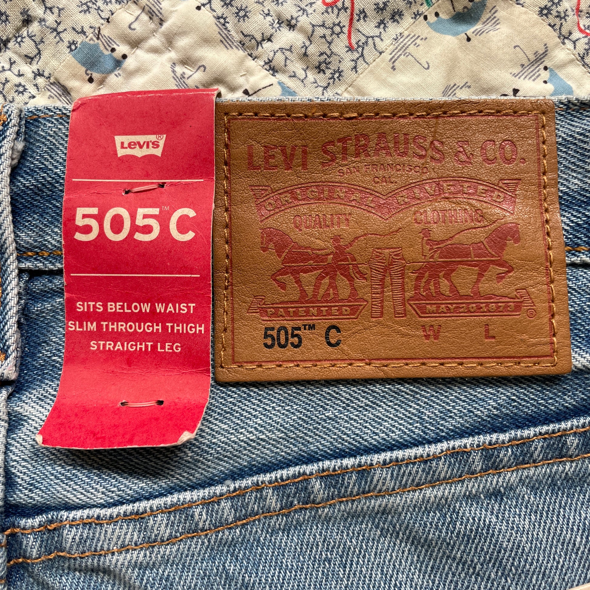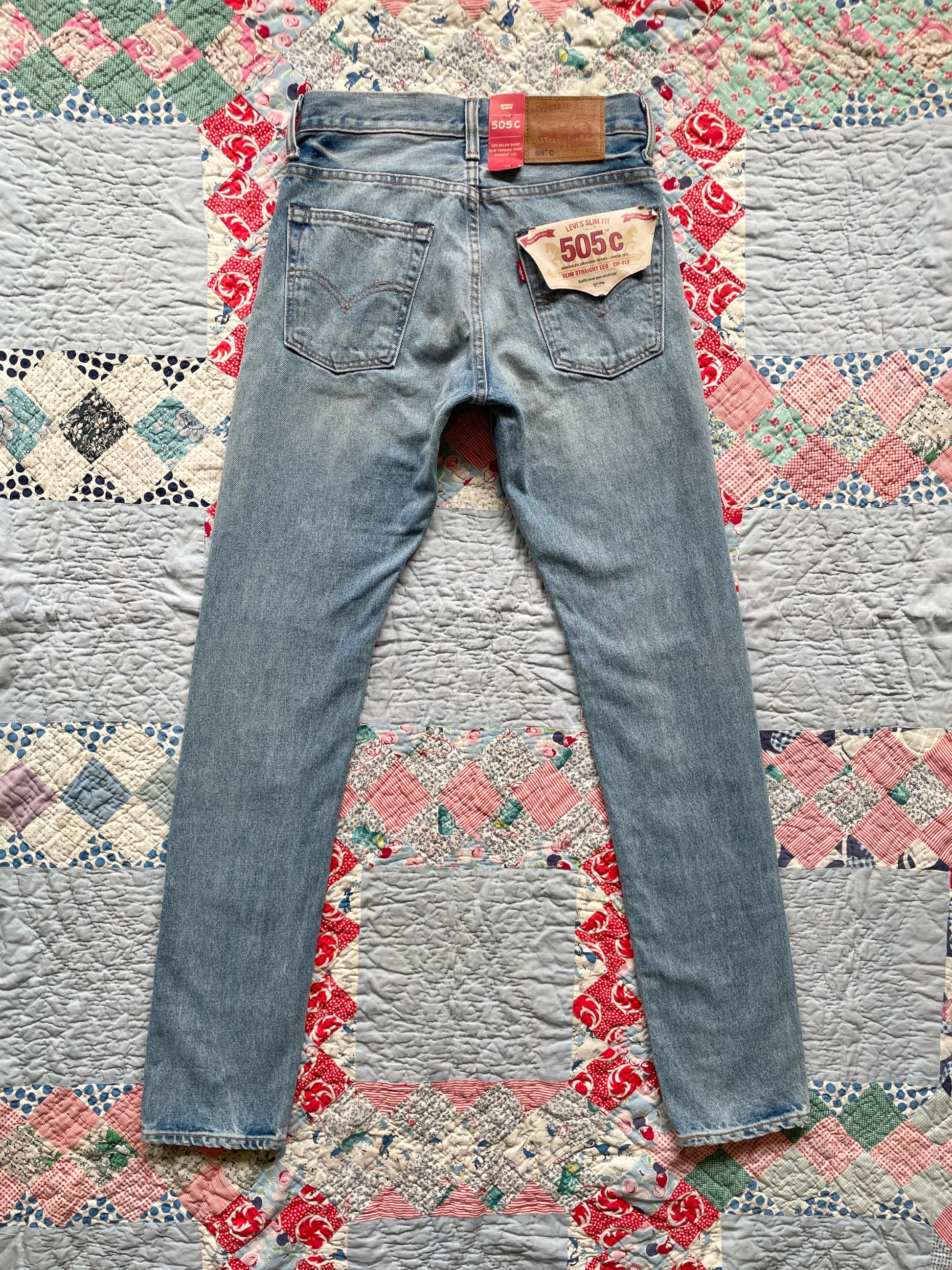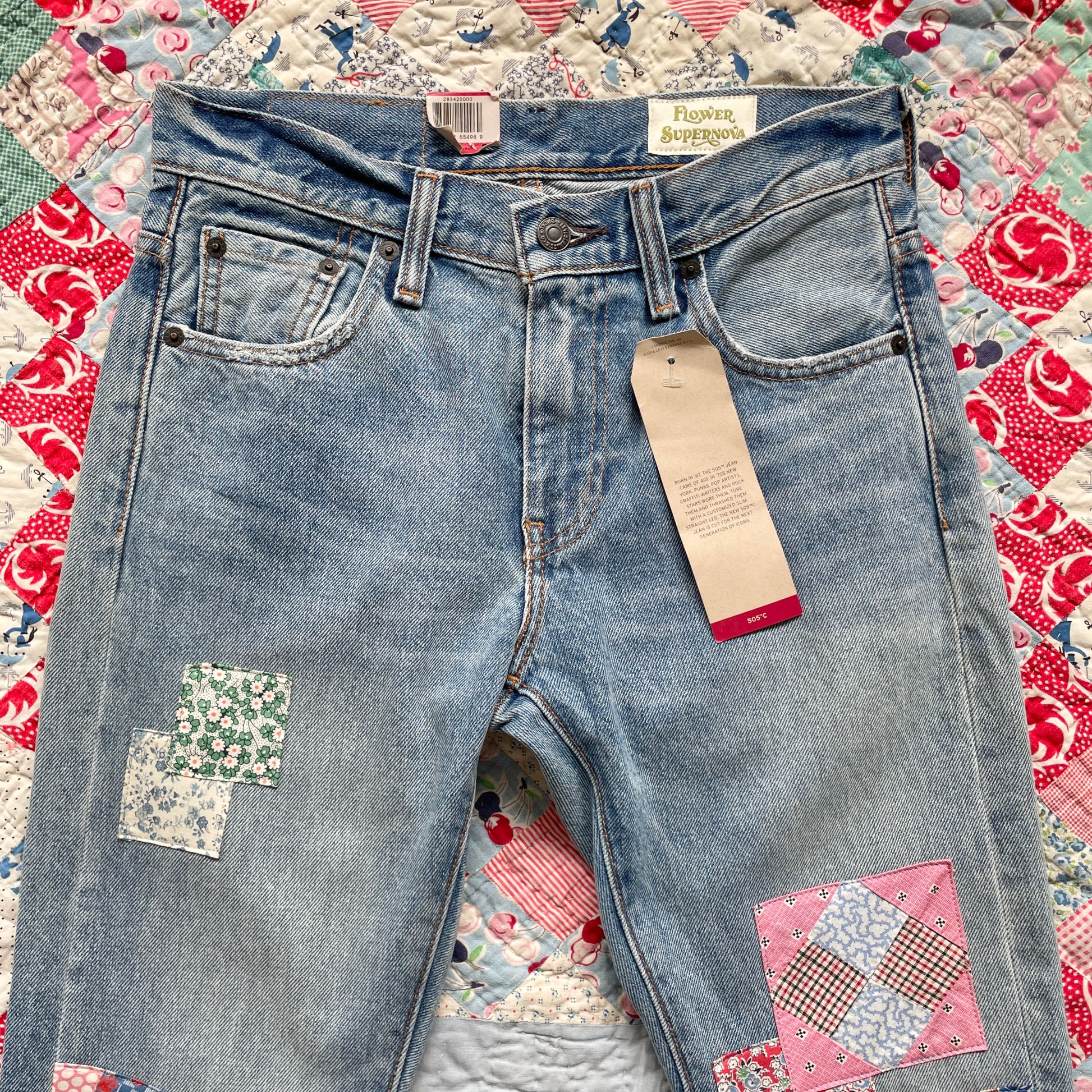 New/Unworn Levi's 505C jeans thoughtfully upcycled with repurposed textiles and vintage quilt fabrics. The patchwork detailing, rich with character, adds a unique touch to classic Levi's jeans. Each piece is carefully selected and sewn with love, every stitch merging past and present.