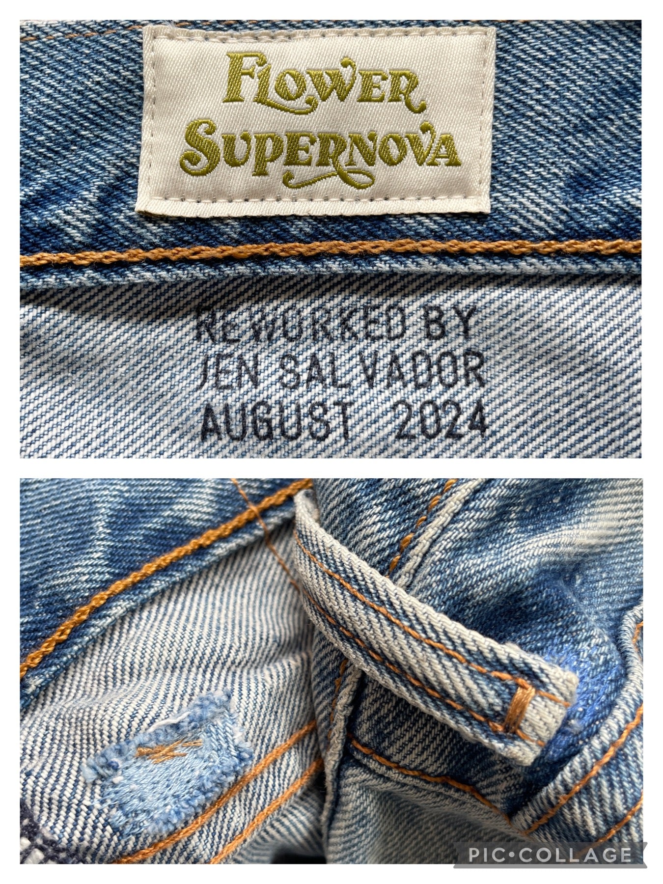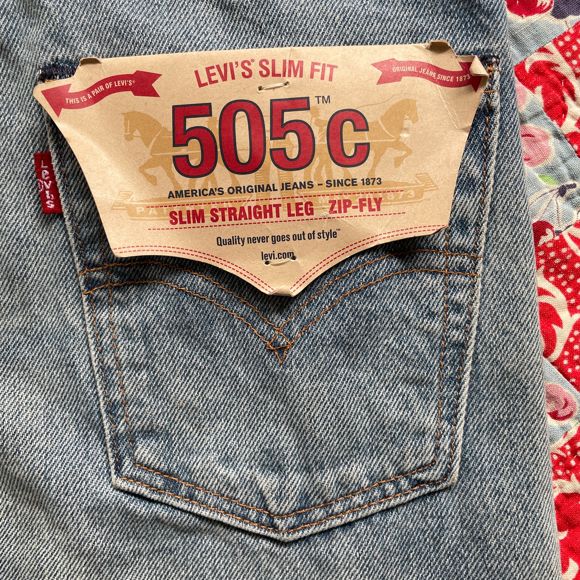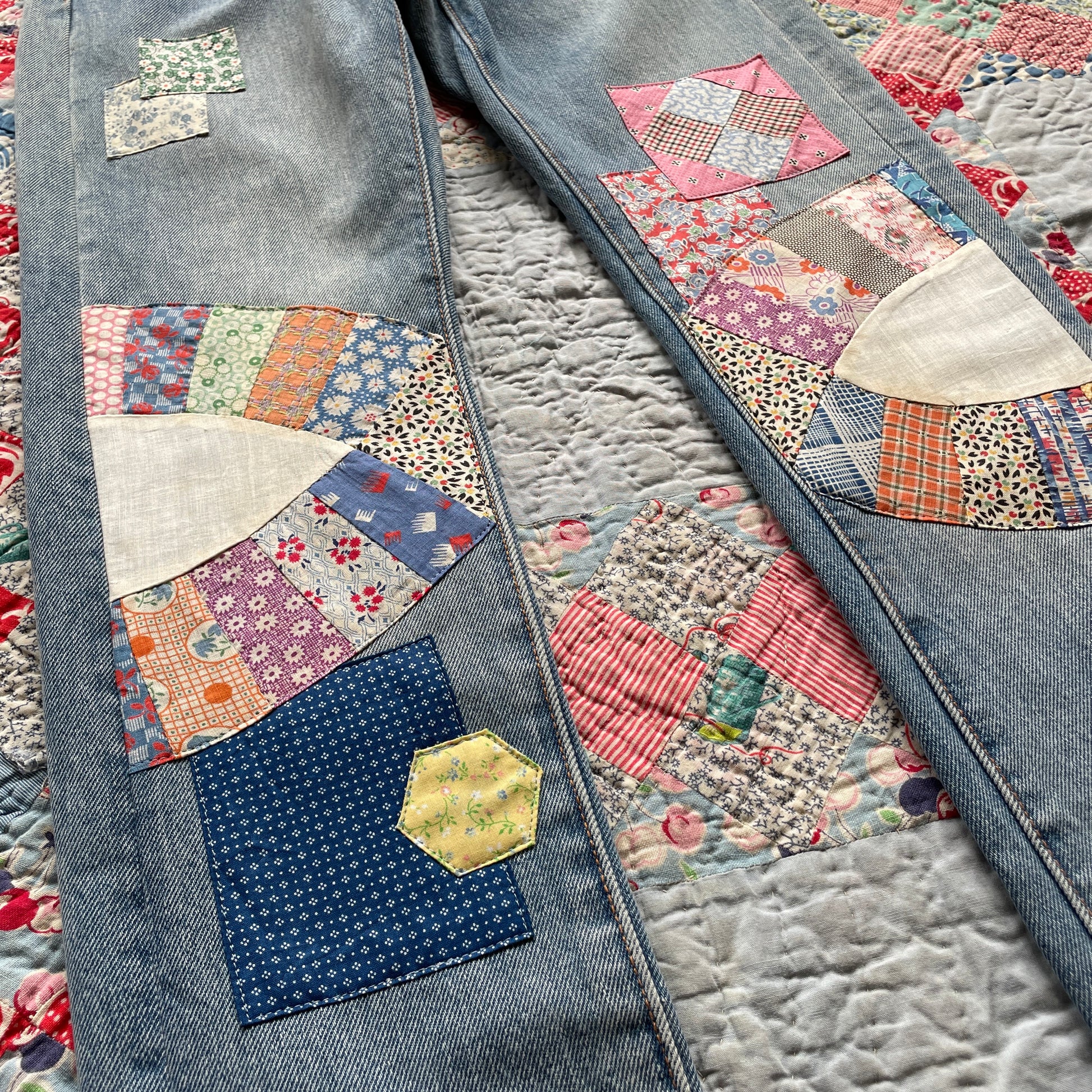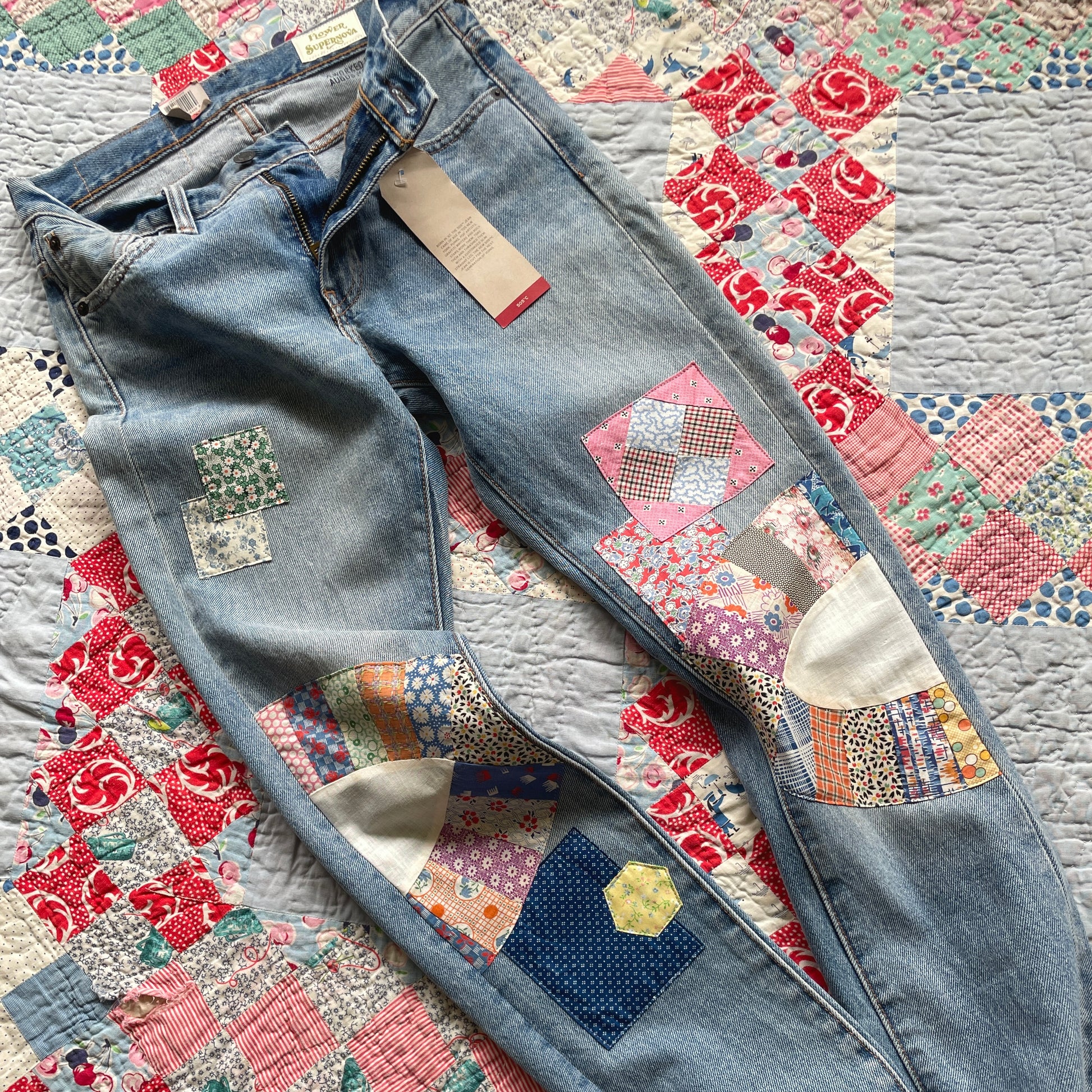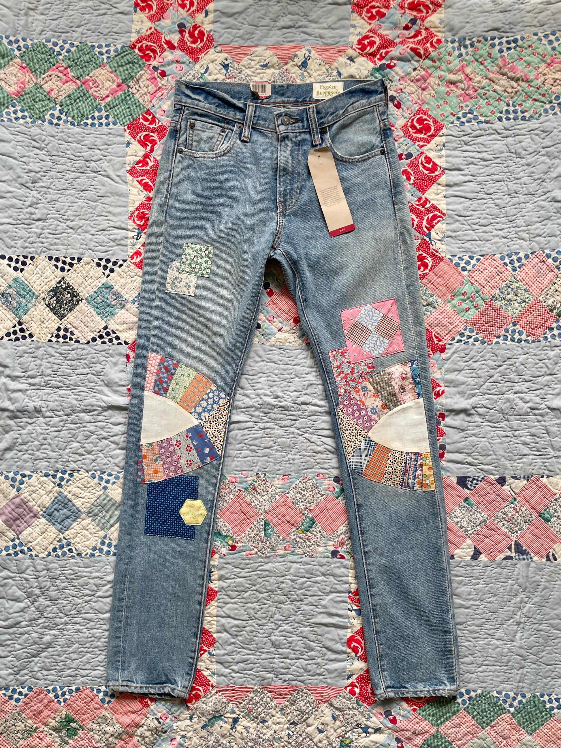 New/Unworn Levi's 505C jeans thoughtfully upcycled with repurposed textiles and vintage quilt fabrics. The patchwork detailing, rich with character, adds a unique touch to classic Levi's jeans. Each piece is carefully selected and sewn with love, every stitch merging past and present.