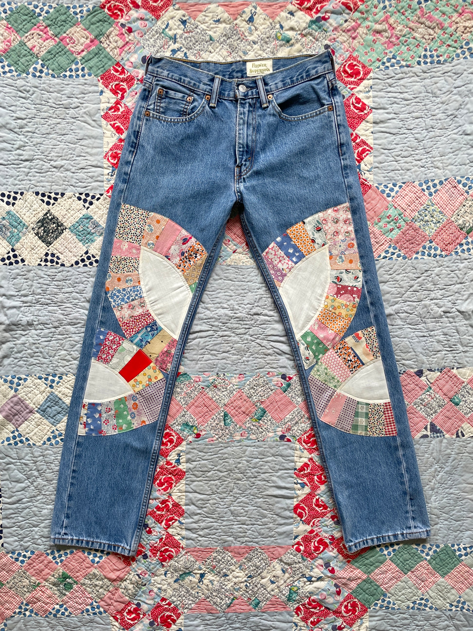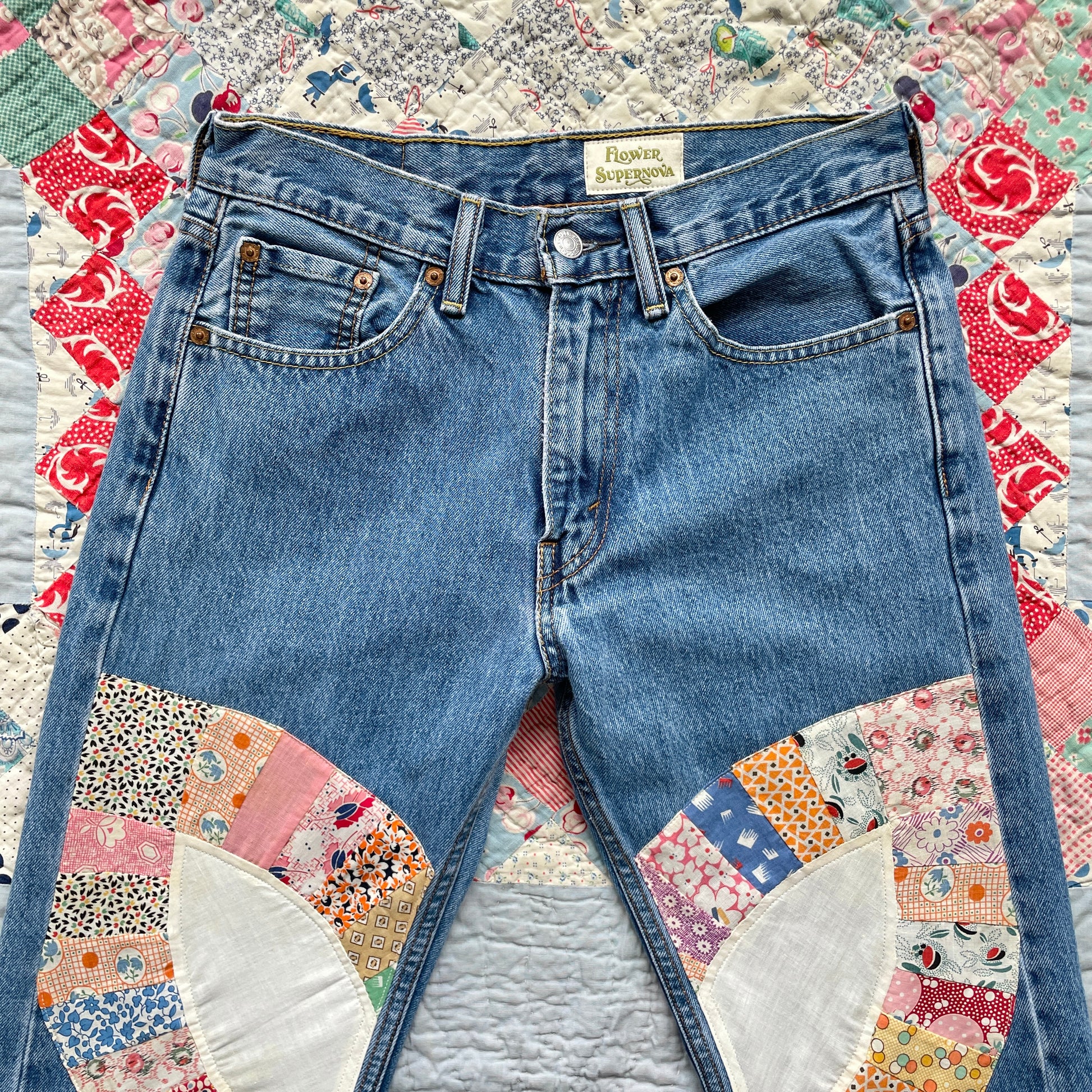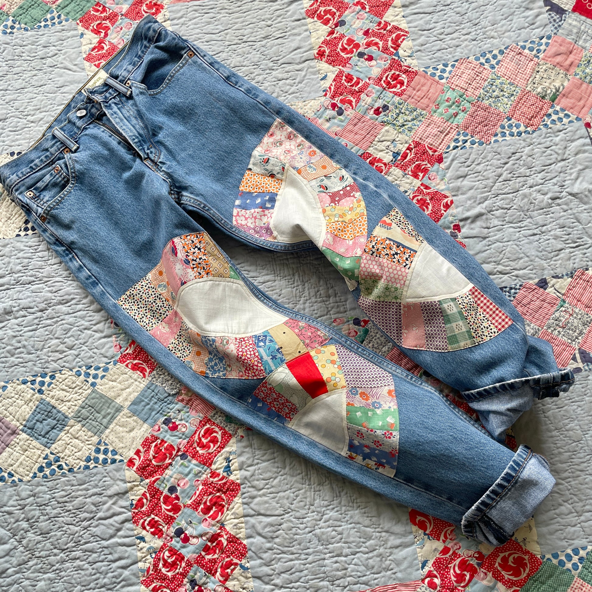 Levi's 505 jeans thoughtfully upcycled with repurposed textiles and vintage quilt fabrics. The patchwork detailing, rich with character, adds a unique touch to classic Levi's jeans. Each piece is carefully selected and sewn with love, every stitch merging past and present.