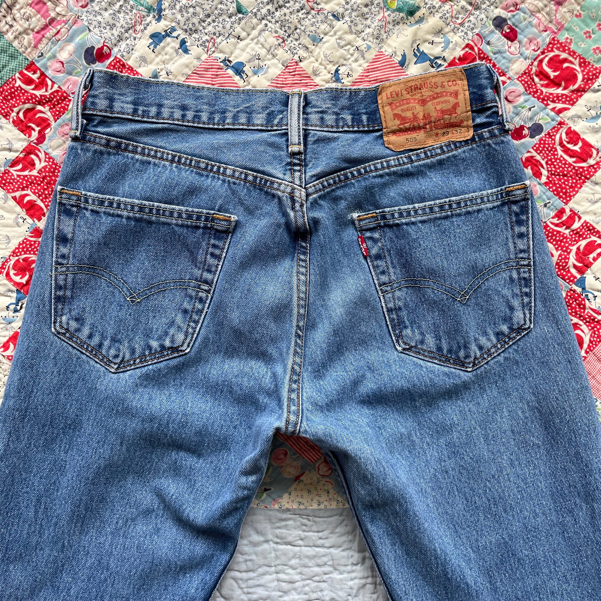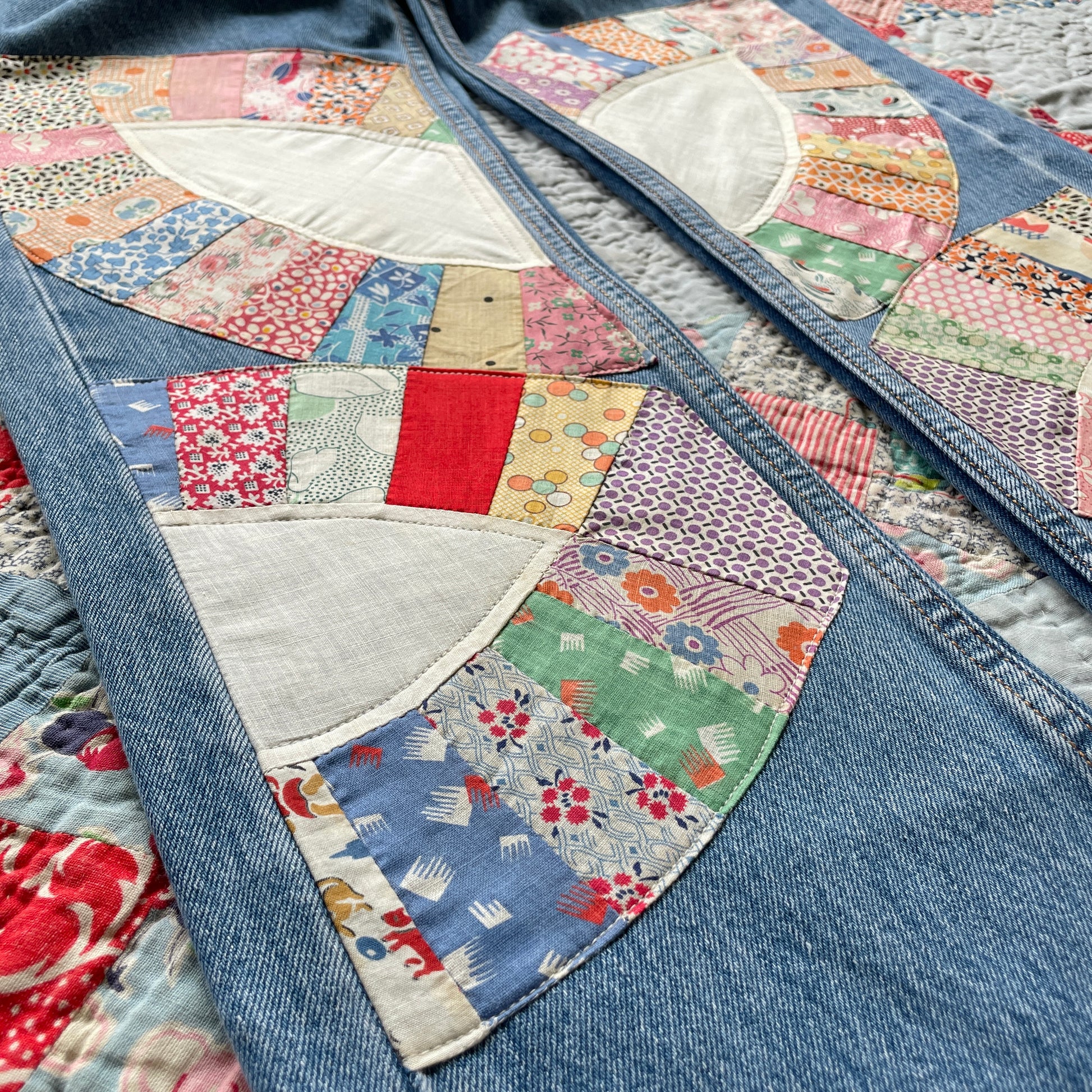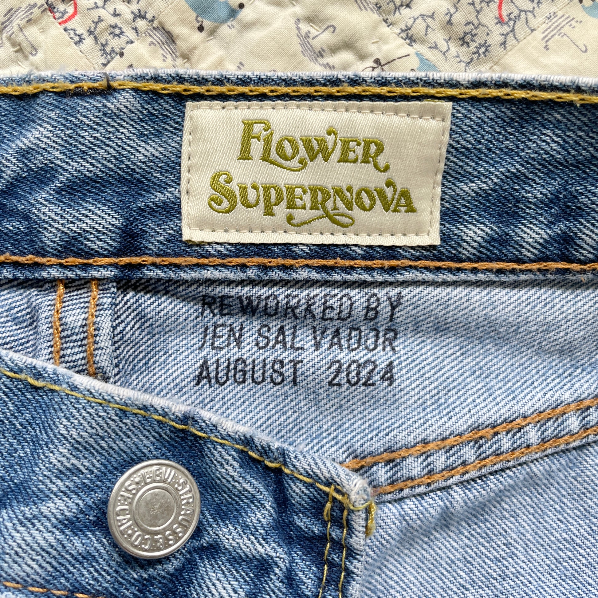 Levi's 505 jeans thoughtfully upcycled with repurposed textiles and vintage quilt fabrics. The patchwork detailing, rich with character, adds a unique touch to classic Levi's jeans. Each piece is carefully selected and sewn with love, every stitch merging past and present.