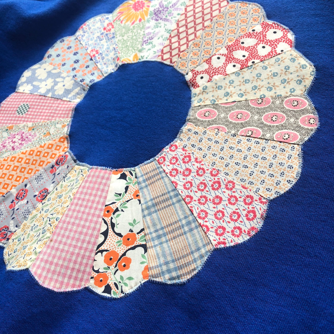 Cozy pre-owned sweatshirt with vintage quilt patch. This patchwork appliqué was repurposed from an unfinished quilt made in my favourite pattern - the Dresden Plate. It consists of 20 'petals' in colourful, vintage floral prints.